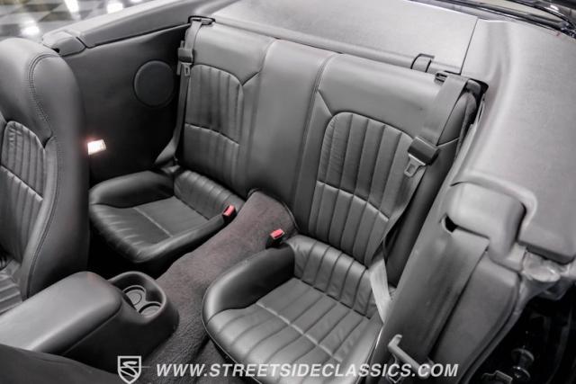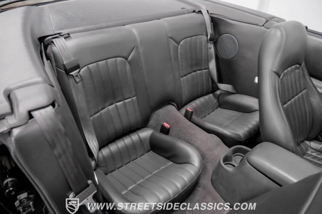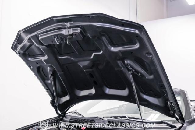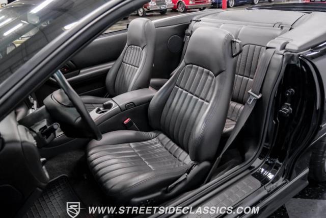 This triple black 2002 Chevrolet Camaro Z/28 Convertible, with only 5,089 actual miles, represents the final year of the fourth-generation Camaro. Finished in Onyx Black, this Z/28 embodies raw American muscle. The black cloth top, when lowered, accentuates its aggressive profile. It rides on 18\" Corvette Z06-style wheels with 275/35ZR18 Michelin tires, giving it a commanding presence. The Sport Appearance Package enhances its muscular lines, while the power convertible top with glass rear window adds functionality.