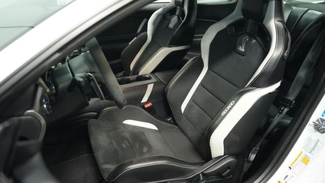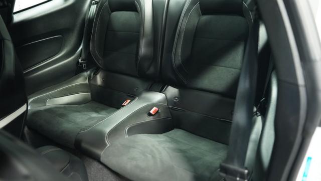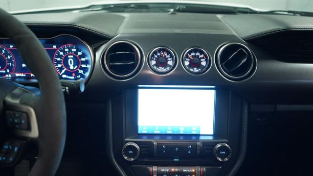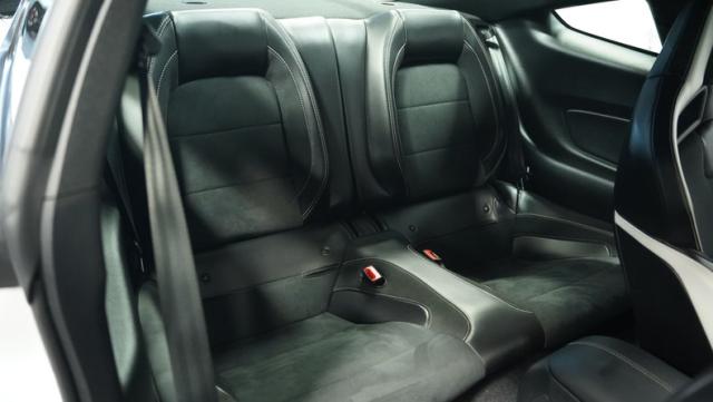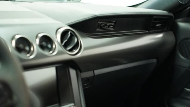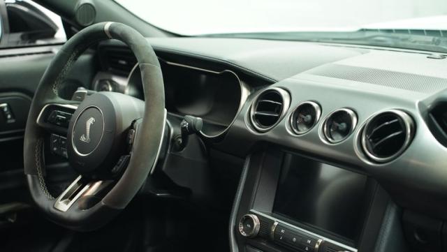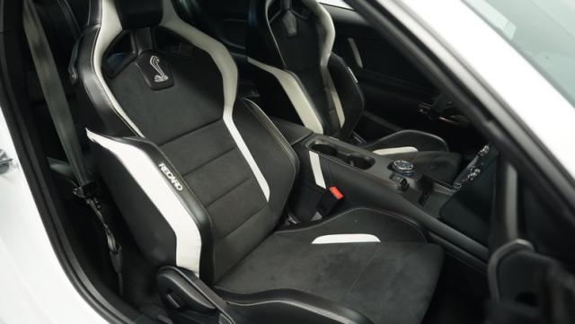 Inside, the black interior is a perfect blend of luxury and performance. Recaro leather and suede bucket seats hold you firmly in place, ready for action. The leather-wrapped steering wheel and console shifter put control at your fingertips. Modern amenities abound, including dual-zone climate control, a touchscreen infotainment system with Bluetooth connectivity, and a 12-speaker Bang & Olufsen sound system. Cobra puddle lamps add a touch of flair, projecting the iconic logo when you approach.