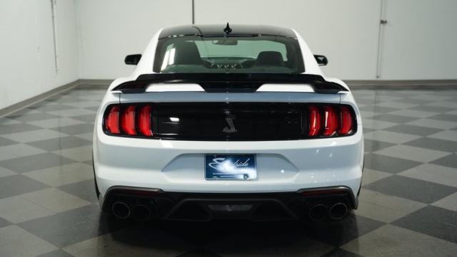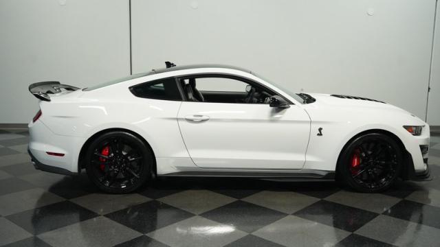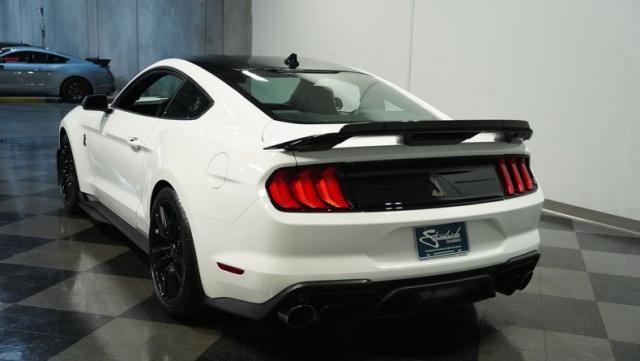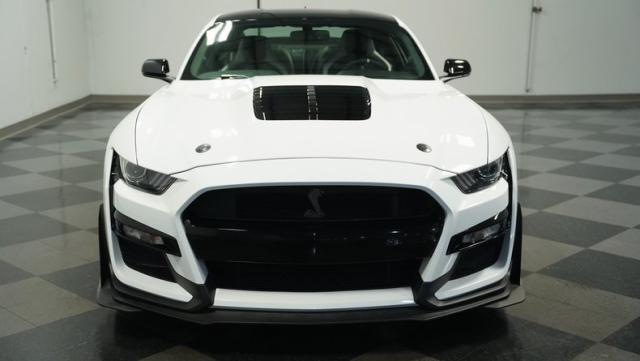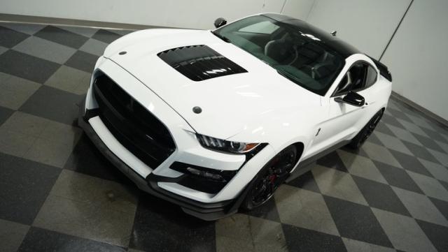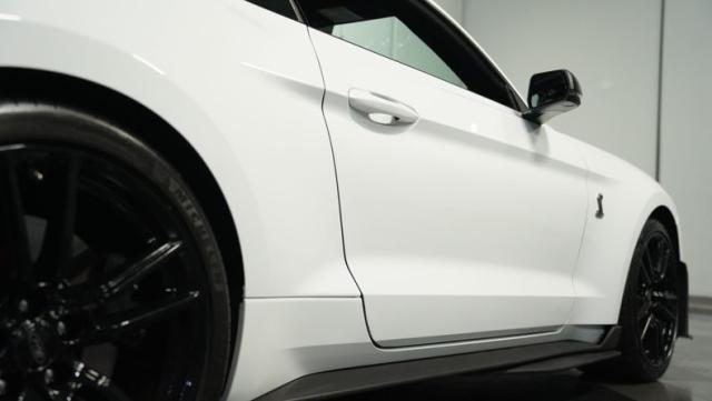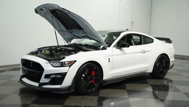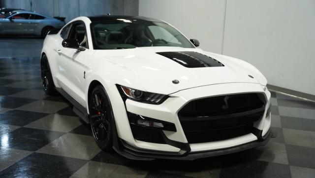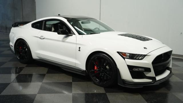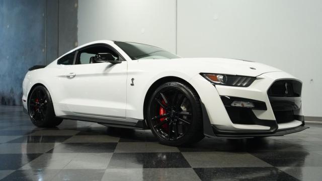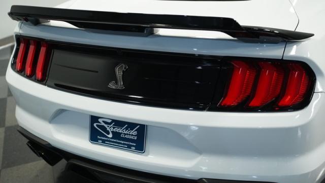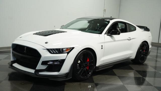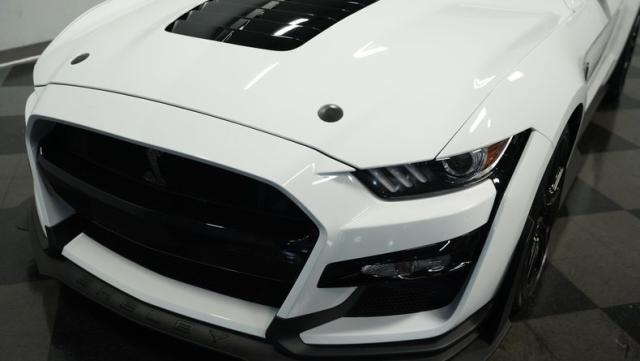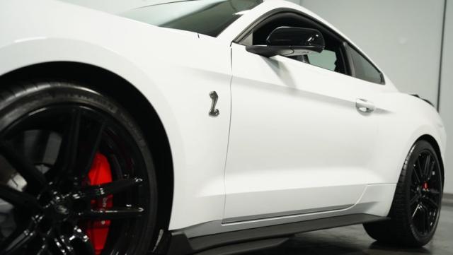 Ford\'s most powerful production car ever, this 2020 Mustang GT500 in Oxford White example showcases raw muscle with refined aerodynamics. The aggressive front fascia, vented hood, and sleek profile speak volumes about its performance potential. Rolling on 20-inch wheels wrapped in 305/30ZR20 front and 315/30ZR20 rear tires, it\'s clear this Mustang means business. The painted black roof adds a striking contrast, while the quad-tip exhaust hints at the beast within.