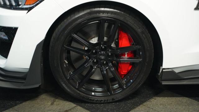 Lifting the vented hood reveals the crown jewel - a hand-built, supercharged 5.2-liter V8 engine. This powerhouse churns out an incredible 760 horsepower and 625 lb-ft of torque, making it the most potent factory Mustang ever produced. Paired with a lightning-fast 7-speed dual-clutch transmission, this GT500 delivers blistering acceleration. The Tremec transmission, magnetic ride control, and Brembo brakes work in harmony to provide an unparalleled driving experience.