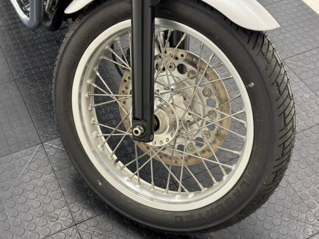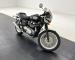 Named for the racing circuit in Andover, United Kingdom, this Thruxton is dressed to kill in stunning two stage black paint on the tank, airbox cover, and apron, accented on the top by a checkered flag patterned stripe. The fenders are adorned in a contrasting coat of silver, a perfect complement to the rim of the chrome wire wheels, here 18-inch in front and 17-inch in back. The bike benefits from minor modifications including bar end mirrors, a Dart fly screen, and S.S. reverse cone mufflers. The black vinyl saddle is nicely contoured and supported by rubber coated footpegs below.