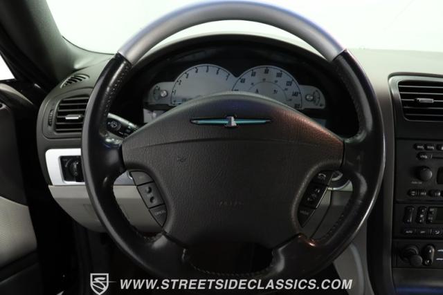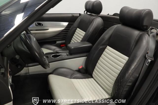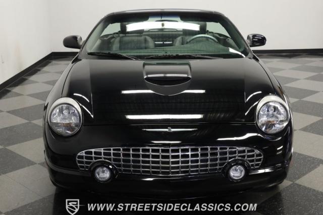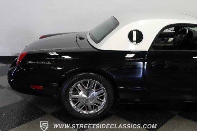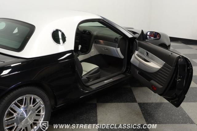 Only 200 examples were ever created for the iconic Neiman Marcus catalog, making this 2002 Ford Thunderbird Neiman Marcus Edition an exclusive find in Evening Black. The streamlined convertible features numerous special touches like the distinctive Thunderbird logo expertly etched into the porthole windows - a hallmark of this limited run. Versatility defines the exterior with both the black canvas soft top and the silver removable hardtop included. The 17-inch chrome Thunderbird wheels add a luxurious touch, wrapped in 235/50R17 tires for proper road contact. Clean chrome accents enhance the flowing body lines while all panels align perfectly - doors, hood, and trunk close with solid precision.