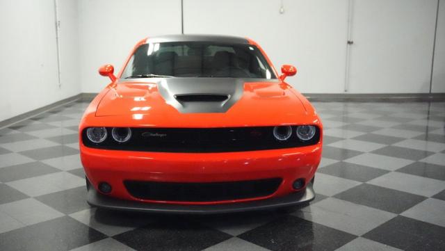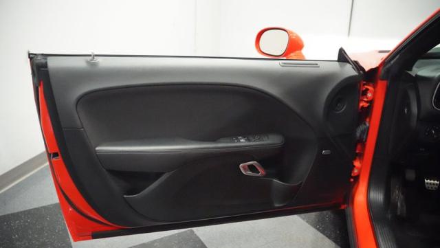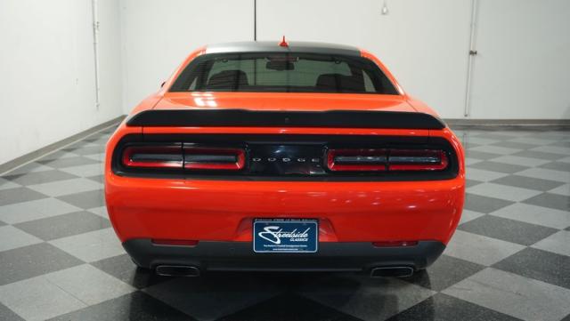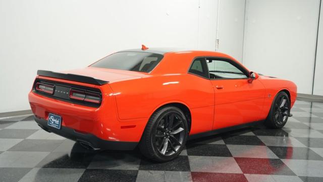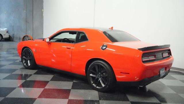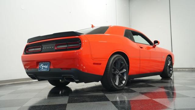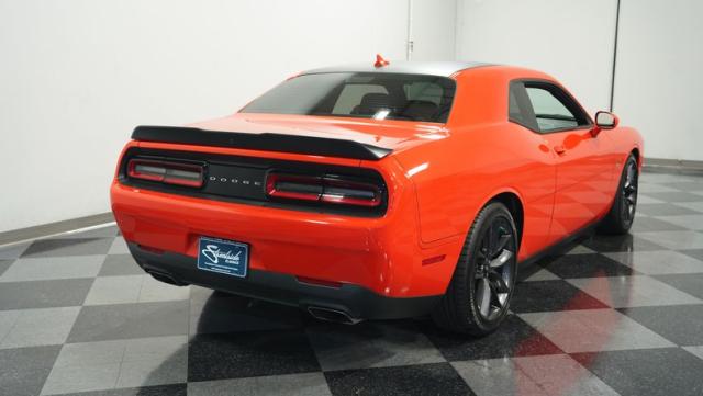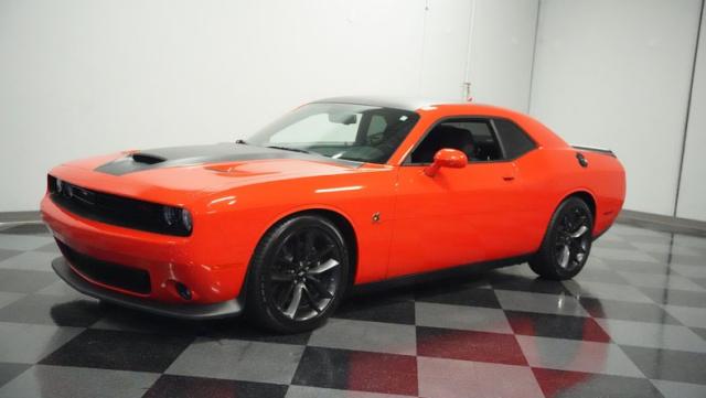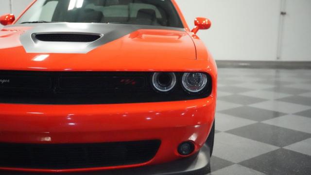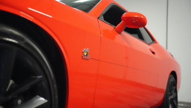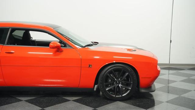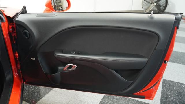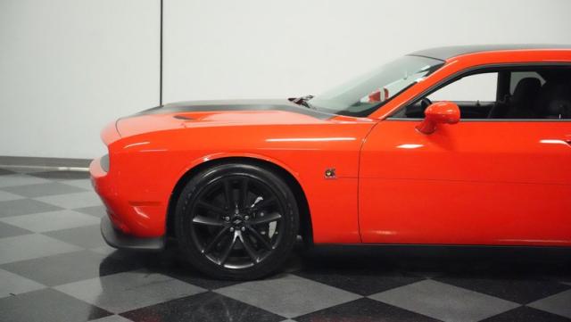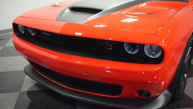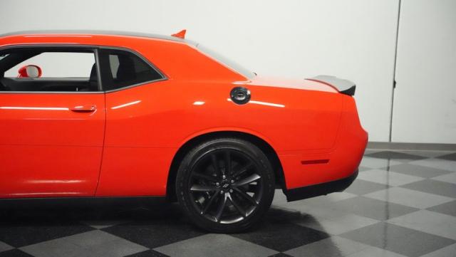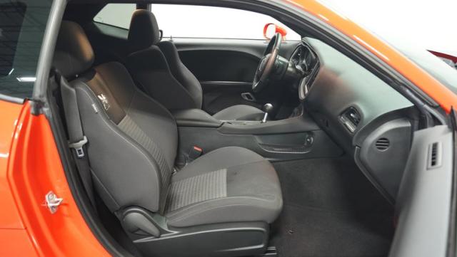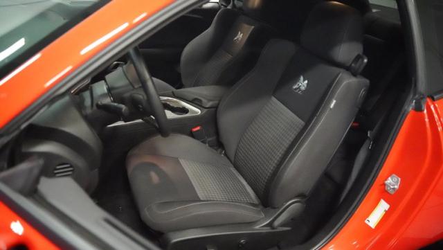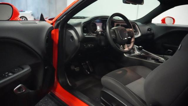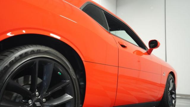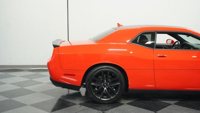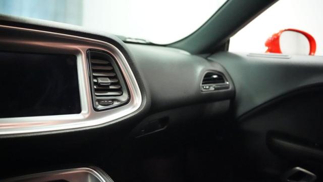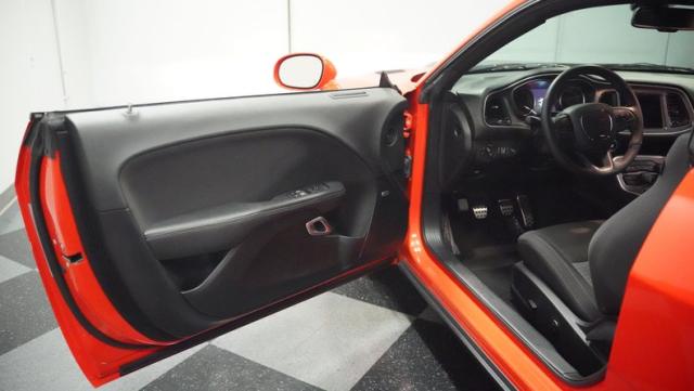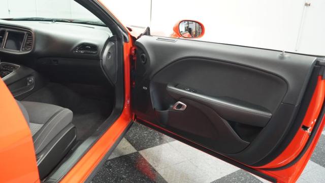 This Challenger\'s Go Mango Orange exterior amplifies its muscular presence with impressive 547 horsepower on tap. The flat black racing stripes and pinstriping create a powerful contrast against the vibrant paint. Factory 20-inch wheels and 245/45ZR20 Michelin tires on all four corners plant this machine firmly to the pavement. Factory Brembo brakes with slotted rotors peek through the spokes, while dual exhaust tips announce its arrival.