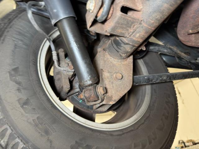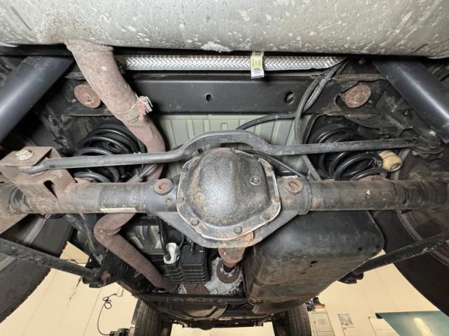 Many components including driveshaft, hub hardware, exhaust, and bolts have copious surface rust which is also present on the edges of the skid pads. Dry conditions are found under the engine but we do note some dampness on the front differential. Beyond that, everything is in place, dirt and grease free. Suspension includes coils springs with radius arms up front and a 3 link with coil springs and panhard bar in back. The single exhaust remains original, including the muffler and basic steel tip.