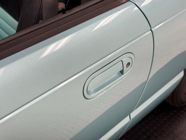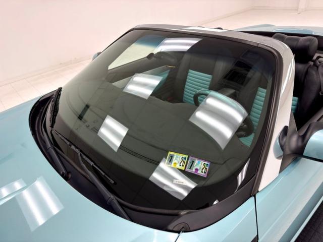 Thunderbird Blue was a name used for one of the first colors for the 1955 Thunderbirds and used here in two stage metallic coverage of a light turquoise. The black canvas top has its own name too, known as Midnight Black in the Thunderbird world and ours shows in very nice condition including its clear plastic window. The long hood and steeply raked windshield and cab back sitting position puts eight feet of car ahead of you and almost as much behind you as the straight shoulder line of the car becomes the rear fenders that terminate with round tail lights that stand vertical and protrude just enough to be visible to drivers to your side. The body cues pick up heavily from the 50\'s except for fins being shaved and front fenders blending with flush headlights. Fender vents also summon the classic Thunderbirds but the 17-inch chrome wheels could not have been imagined in 1955. The grille bows out slightly rather than being perfectly vertical and integrated fog lights live in the front body keyed valance. Overall, the exterior is in superb condition with minor imperfections that include touched up scratches, scuffs on the chin, some orange peel on a lower panel, and a single paint chip.
