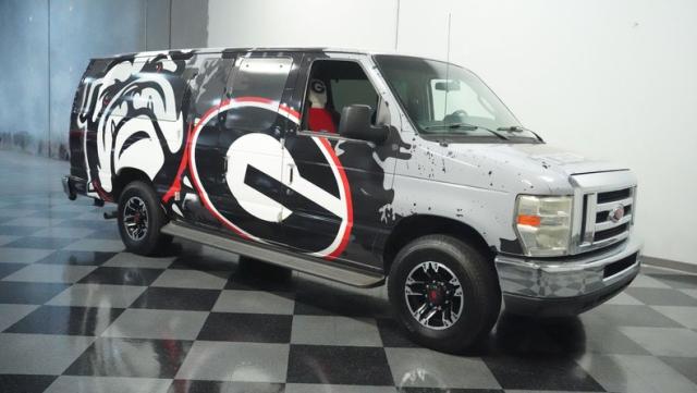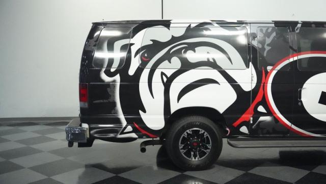 Built for game day glory, this 2009 Ford E-350 rocks a full UGA custom wrap that\'ll make any Bulldogs fan proud. The exterior transformation includes Ultra Motorsports 16-inch wheels paired with 245/75R16 Goodyear tires for a tough stance. The specialized side-entry design incorporates step boards for easy access, while rear barn doors open wide for ultimate tailgate setup. The TVs mounted behind tinted windows add to the game day experience, with custom window treatments that block outside views for private viewing.