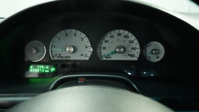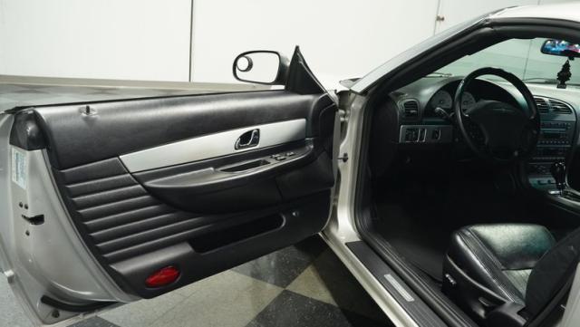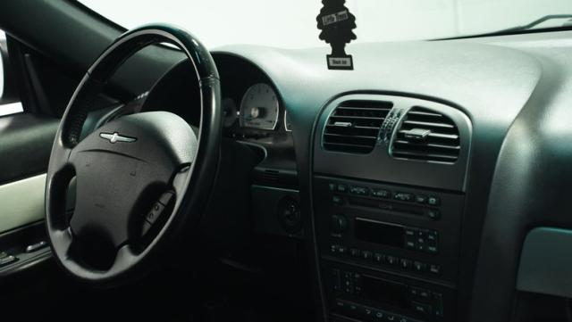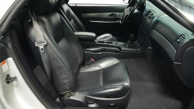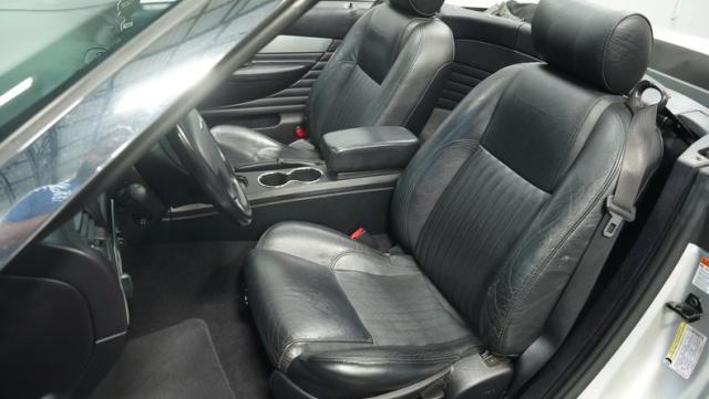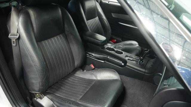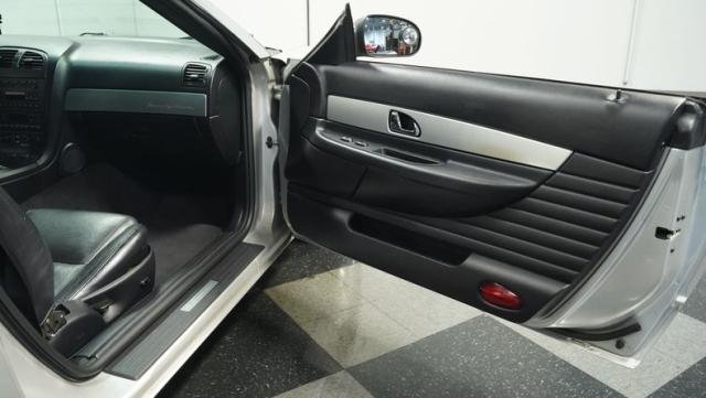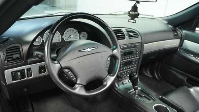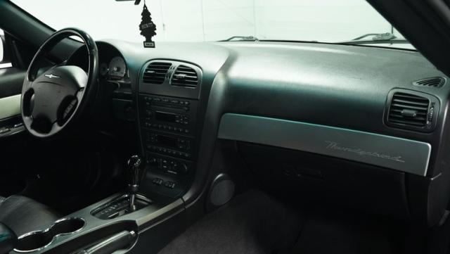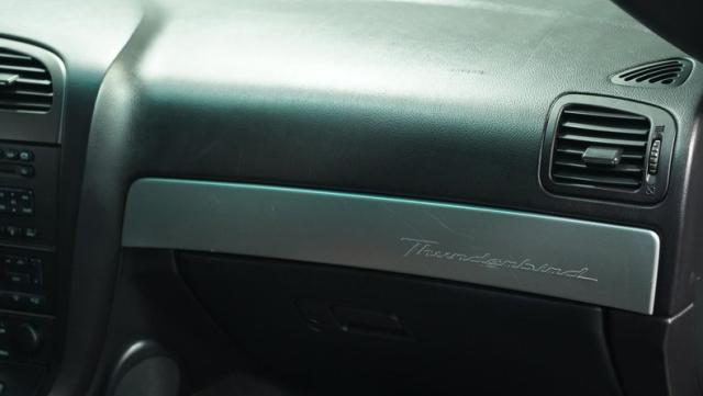 Inside, the Thunderbird offers a luxurious black leather interior, with bucket seats that provide both comfort and support. The cabin is equipped with modern amenities, including power steering, air conditioning, and an AM/FM CD changer, ensuring a pleasant driving experience. The center console houses a well-placed shifter, and the overall interior design reflects a blend of classic styling and contemporary comfort.