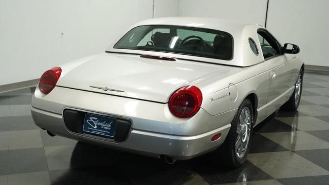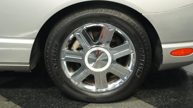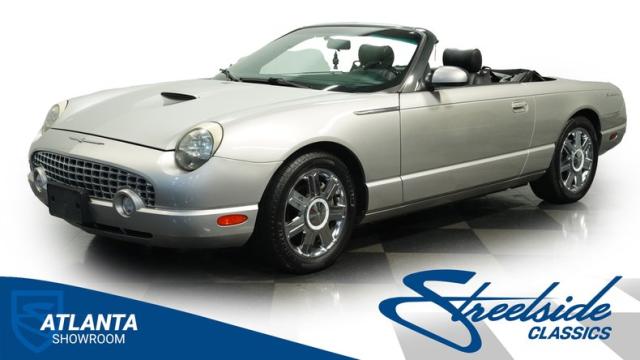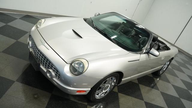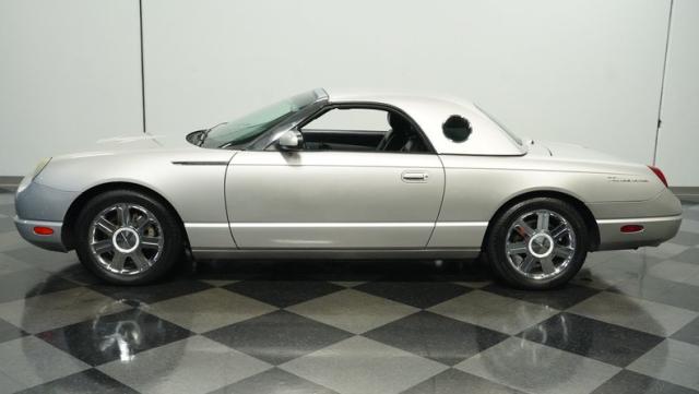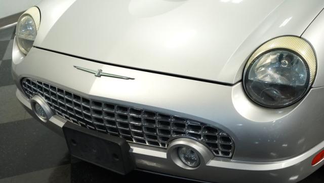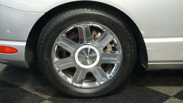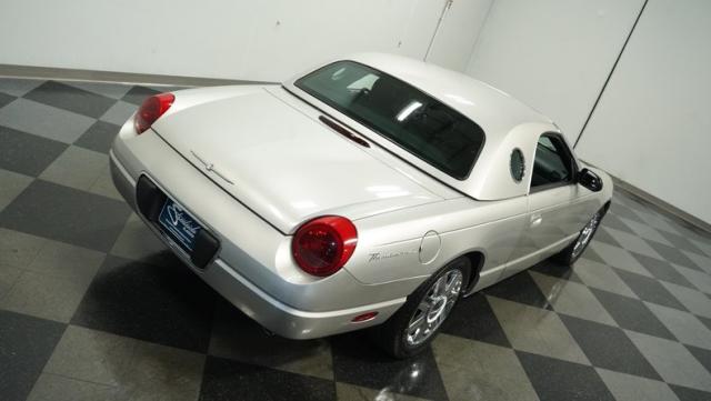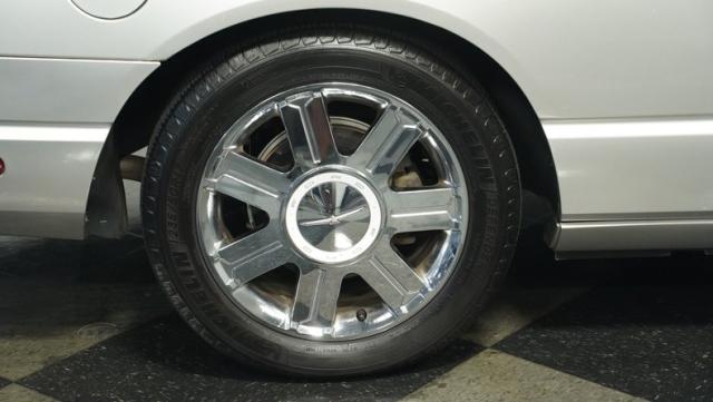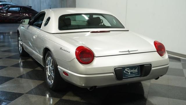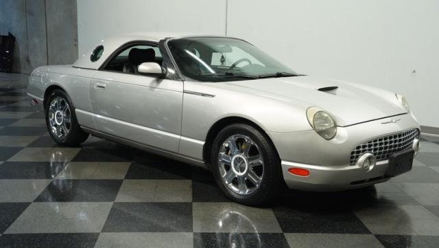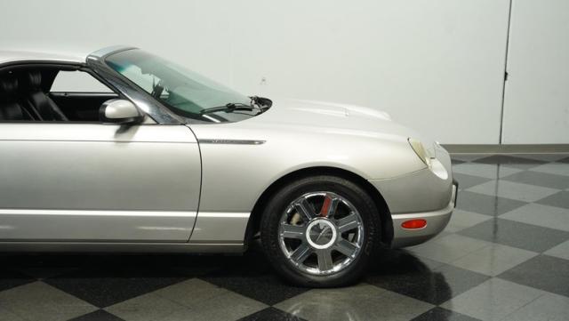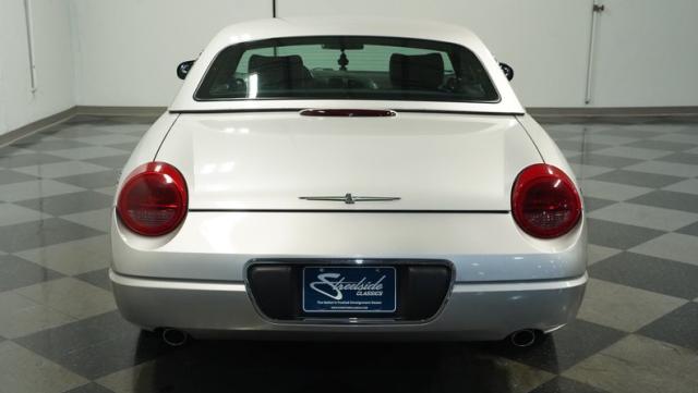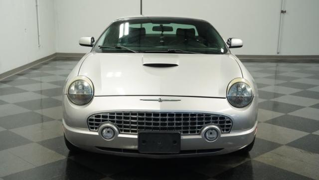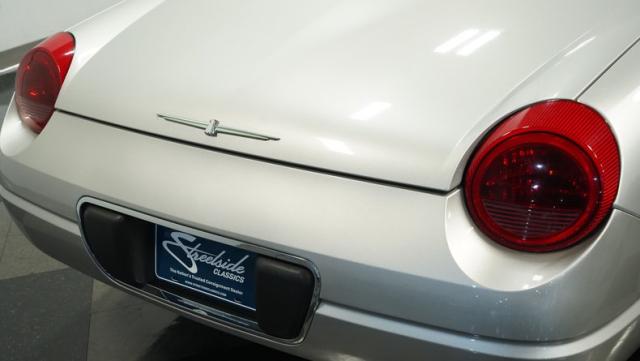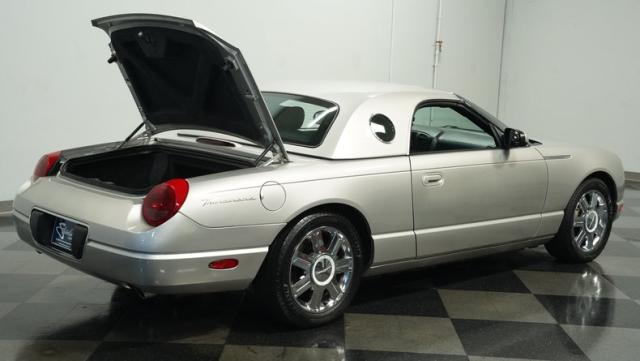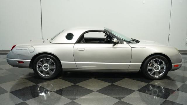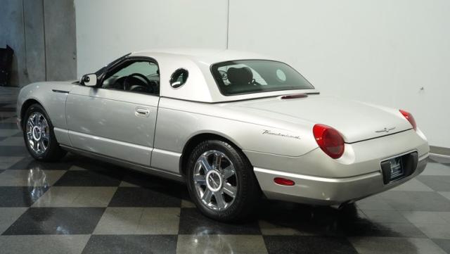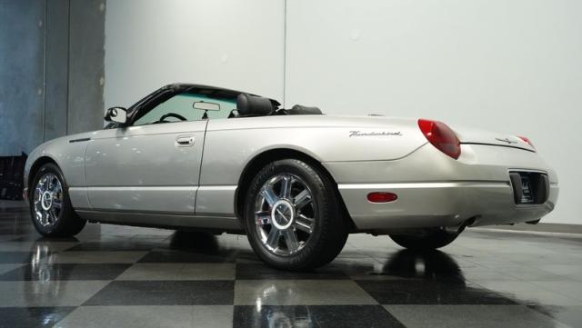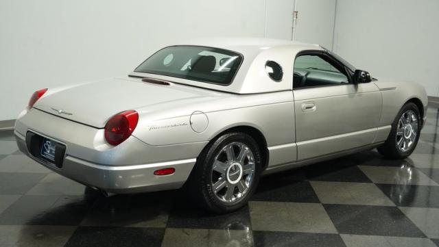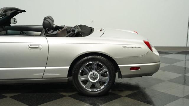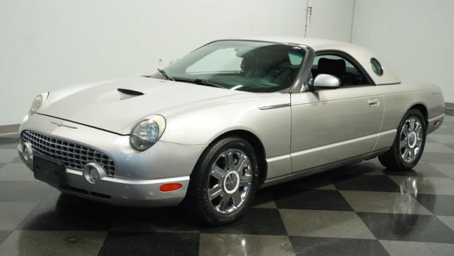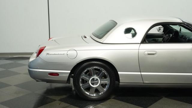 Celebrating 50 years of the iconic Thunderbird, this 2005 Ford Thunderbird is a low-mileage gem cloaked in a stunning Platinum Silver Metallic exterior. With only 65,086 miles on the odometer, this final-year model is a must-have for collectors and enthusiasts. The 17\" wheels and 235/50R17 Michelin tires provide a confident stance, while the black canvas soft top and silver factory hard top offer the best of both worlds.