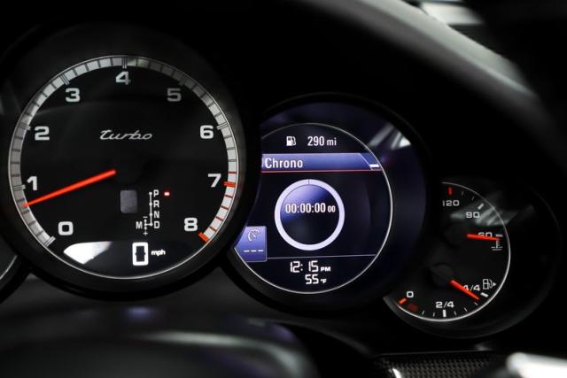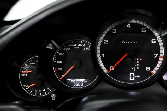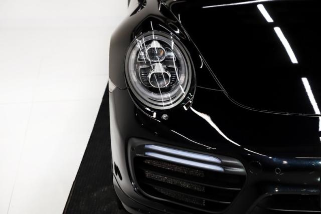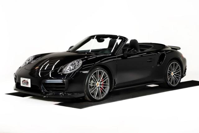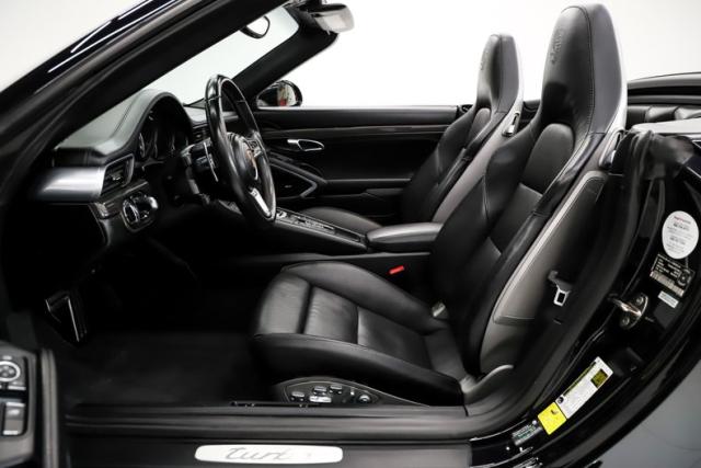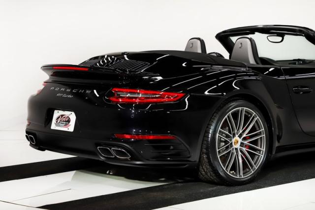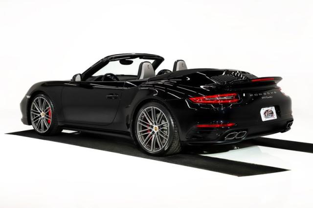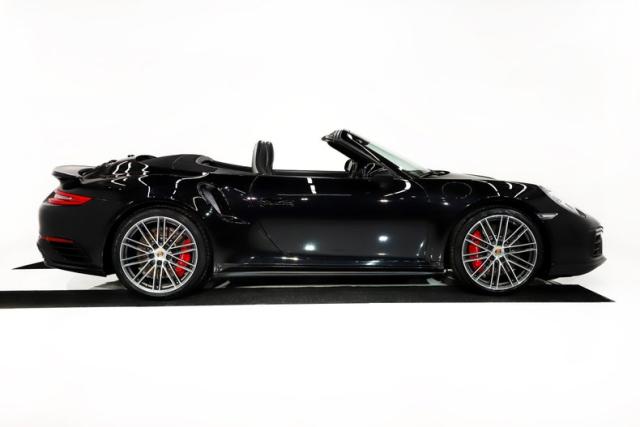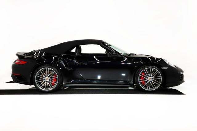 EXTERIOR: This 911 combines classic styling with purposeful, performance-driven design. Up front, signature round headlights with optional modern dynamic system, large air intakes, and a sculpted front splitter give it an aggressive yet refined presence, clearly hinting at the Turbo\'s serious capabilities. From the side, wide flared rear fenders with optional painted to match air intakes define its muscular stance, a Turbo trademark that visually anchors the car to the road. The fabric cabriolet top integrates cleanly into the roofline, maintaining a sleek silhouette whether raised or lowered. At the rear, an active rear spoiler extends at 75mph, LED lights and dual exhaust outlets create a planted, high-performance look. Overall, the design is timeless, athletic, and unmistakably Porsche, blending open-top elegance with supercar intent. The Jet Black Metallic is slick and the hood is protected with paint protection. The 20 inch center lock wheels really plant this rocket to the pavement, they are adorned with optional Porsche crests at their centers.