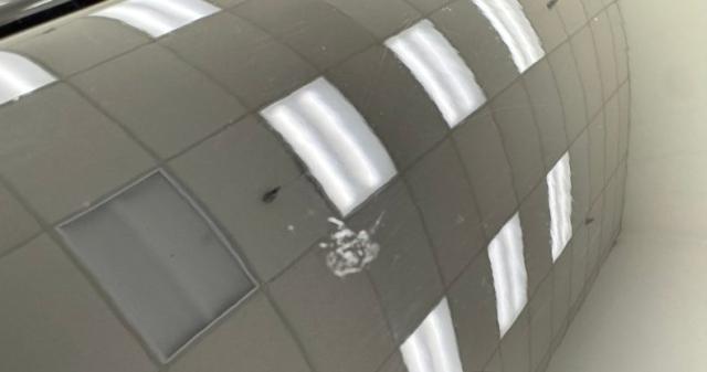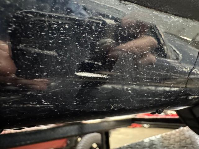 The sleek C5 body style is only made sleeker by the black paint and like the point of a Sharpie pen, this wedge shaped speed demon cuts through the wind with a narrow nose and steeply raked windshield. Functional body features are slightly muted including the heat extracting duct on the front fender and the brake cooling duct on the dogleg, and a black Z06 is stealthier than the other colors. But the quad tail lights out back pop off the end piece while the fantastic quad exhaust makes their usual ground hugging appearance. Staggered size tires are used on staggered sized Z06 wheels, here in argent gray with red calipers peeking through. Imperfections on this well preserved Vette include some spots on the hood, paint damage on the front, rear fender, and decklid, along with various chips, scratches, a nasty deep scuff on the rocker panel, and some curb rash.