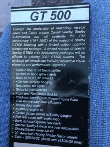 2007 FORD SHELBY GT 500 - Carbon fiber front fascia splitter - Aluminum hood grille inserts - Deck lid SHELBY letter kit - 40th Anniversary Badging Kit - Sequential tail lights - Stripe Kit (Convertible) - Front and rear brake duct kit - CSM - numbered dash plaque / engine plate - 40th anniversary sill plates - Shelby floor mats - Aesthetic engine kit - Center gauge cluster w / Shelby Gauges - Arm rest cover with snake logo - Borla exhaust system (cat-back) - Special Shelby / Eibach coil over suspension - Shelby / Eibach sway bar kit - 20\' American Racing Shelby Razor Wheels - Tires - 255/30/20 (front) and 285-30-20 (Rear) Please Note The Following **Vehicle Location is at our clients home and Not In Cadillac, Michigan. **We do have a showroom with about 25 cars that is by appointment only **Please Call First and talk to one of our reps at 231-468-2809 EXT 1 ** FREE Consignment Visit Our Site Today Easy To List Your Vehicle and Get it Sold in Record Time.