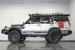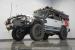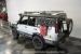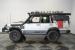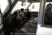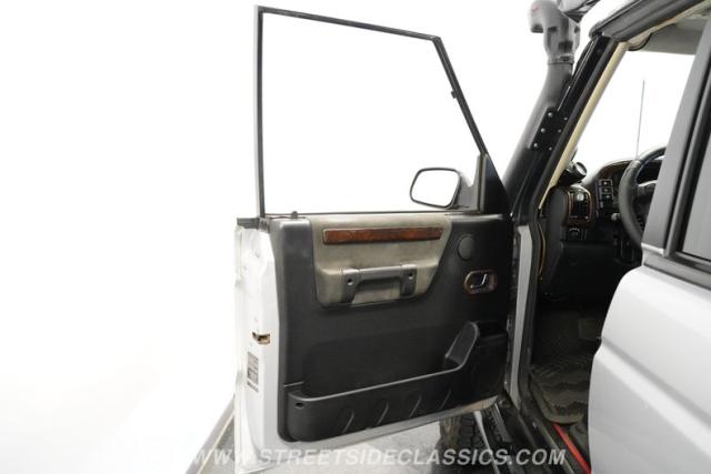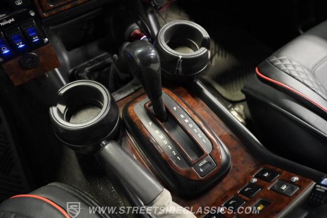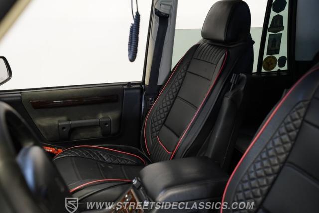 Inside, the cabin is thoughtfully designed for both comfort and utility. Front seats are covered in black vinyl with striking red piping, while the rear bench retains its original black leather upholstery. Rubber floor mats protect against the elements, and the center console hosts manual shifters alongside numerous auxiliary switches for controlling exterior lights and accessories. The dashboard features aftermarket gauges complementing the factory cluster, with a Kenwood stereo system and a CB radio mounted near the moonroof for communication on the trail. A rear hatch kitchen setup adds convenience for extended trips.
