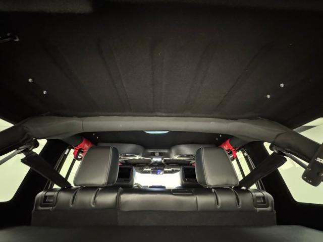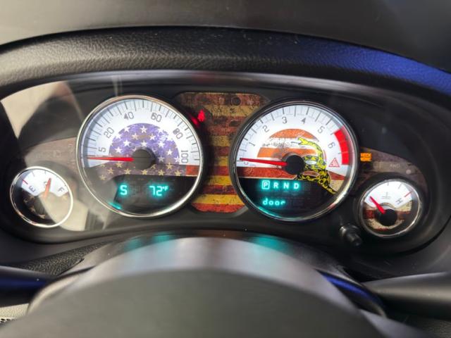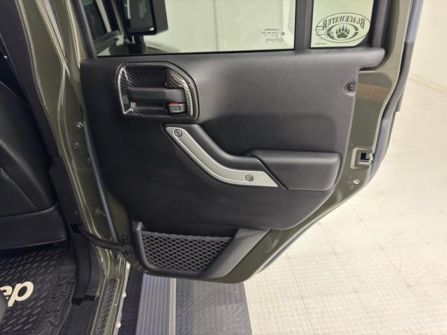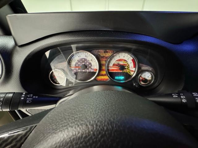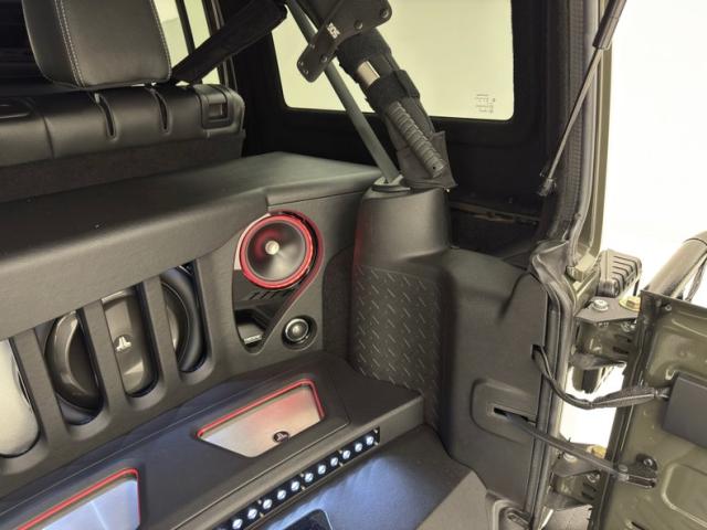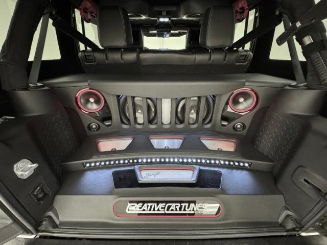 Let\'s start in the way back where Creative Car Tunes has custom fits speakers and subwoofers, emulating the front face of a Jeep while doing so. Up front, the door panels appear stock with the exception of some carbon fiber trim on the black plastic. The leather bucket seats are robust up front and dressed up with some white stitching and embroidered SAHARA on the seat backs, while the rear bench presents cleanly with the same stitching, allowing passengers to view the headrest screens in front of them in comfort. For the driver, the thick steering wheel frames gauges with patriotic backing in a clean and show worthy presentation that includes the Gadsden rattlesnake. A big screen in the center houses the entertainment system that includes AM/FM radio with CD, Bluetooth, Navigation, and a backup camera. Below it, meaty components include switchgear, vents, and the standard A/C panel. More carbon fiber trim adorns the shifter and cupholder in the center console and clean black carpet is protected by tire track weather mats. Lots of extra hand holds are mounted near the ceiling which is covered with clean black cloth panels.