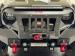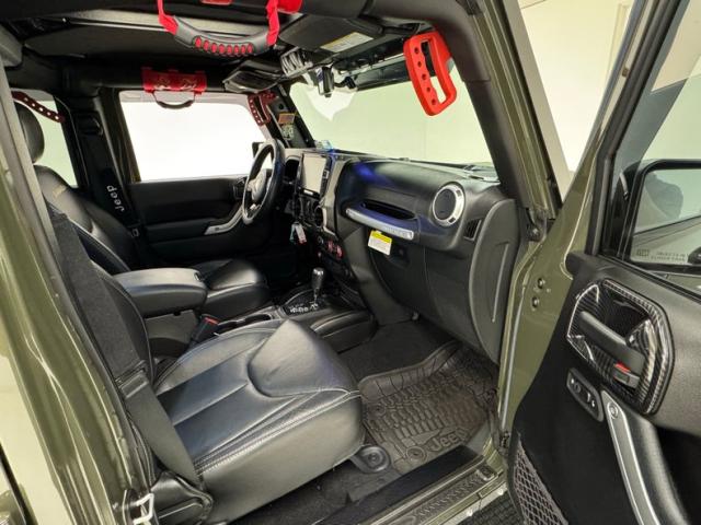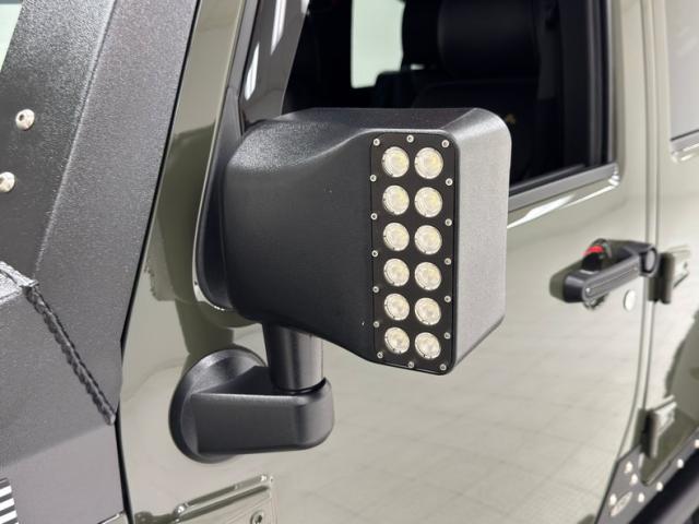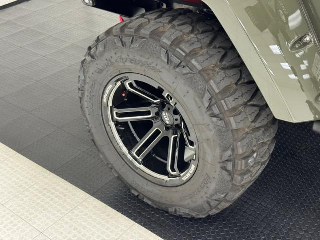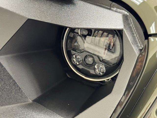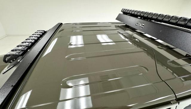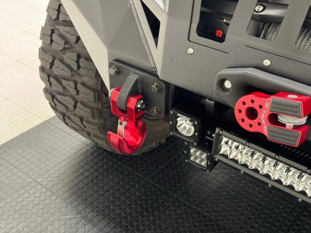 Looking very much like a 4x4 super hero, this Sahara has taken on a muscular appearance with the no holds barred addition of exterior features that expand its Tank Clearcoat dark green coverage. It starts with the bold Fab Fours front grille and bumper behind which is tucked a Warn winch. Up front, there are enough added LED\'s to light up the Red Rocks theater and red anodized tow hooks. Big \'ol fender flares keep dirt from flying far off of the 20-inch MotoMetal wheels with large Nitto Mud Grappler tires while XRC body armor protects the body between the wheels. Along with patriotic messaging, a tubular bin holds a spare in back while a Fabs Four lighted roof rack is adorned with a light bar in addition to its four embedded lights and the armored windshield frame houses yet another light bar. If you fear the dark or live in the wild, this Jeep will be a resounding solution. Under our lights, we could find no exterior imperfections.