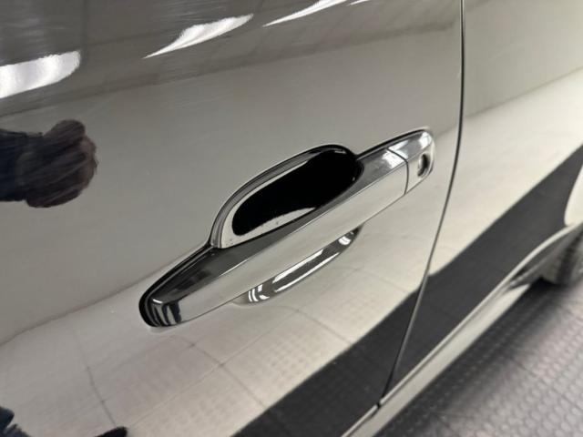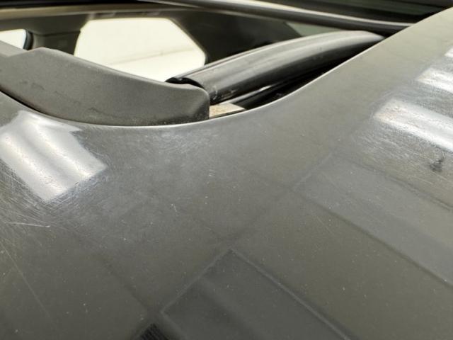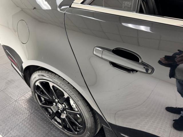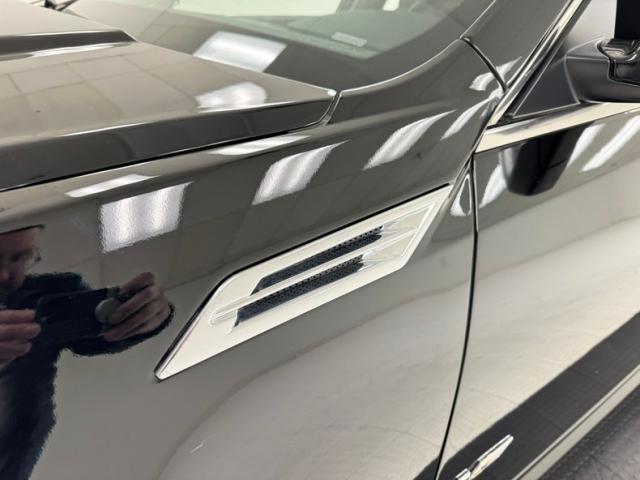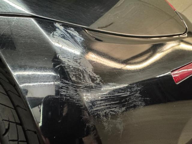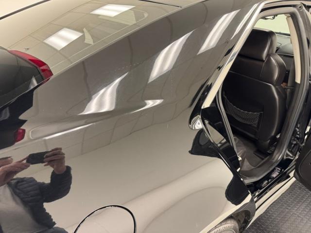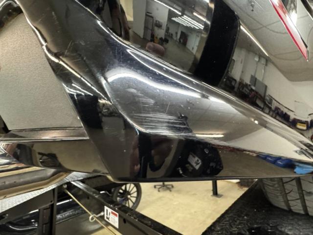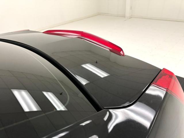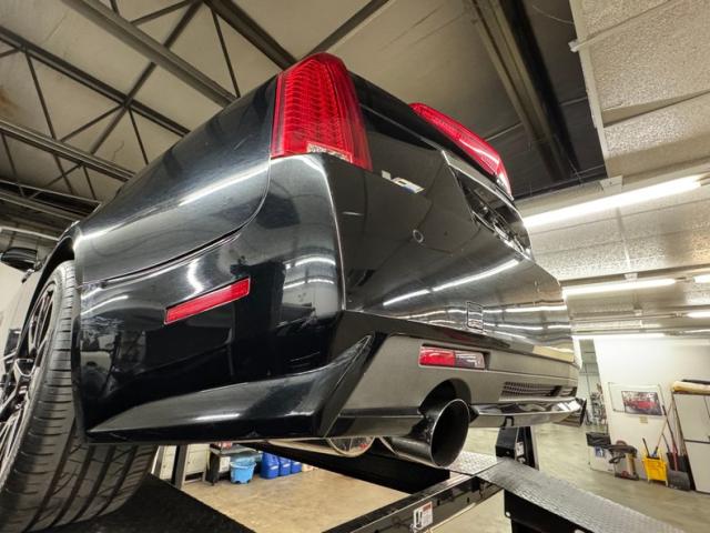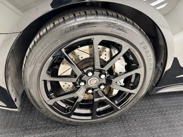 With its facet chiseled design and Black Raven coating for the straight steel, the car retains its unassuming look but in reality, it is a smoker. A mesh chromed upper and lower grille keeps with the Cadillac tradition and mixes V inspired aggression with a touch of luxury, and it fronts a hood that has a subtle power bulge, if there can be such a thing. Four doors allow easy access for thrill riders and the tall vertical back of this car has flush tail lights and a wide third brake light, while two large tailpipes exit just below the integrated bumper and lower splitter. 19-inch black wheels are wrapped in staggered ZR rated tires. Imperfections include numerous scuffs and scratches, crackling plastic on the side mirror, orange peel, and panels that have slightly mismatched quality and shade to their blackness.