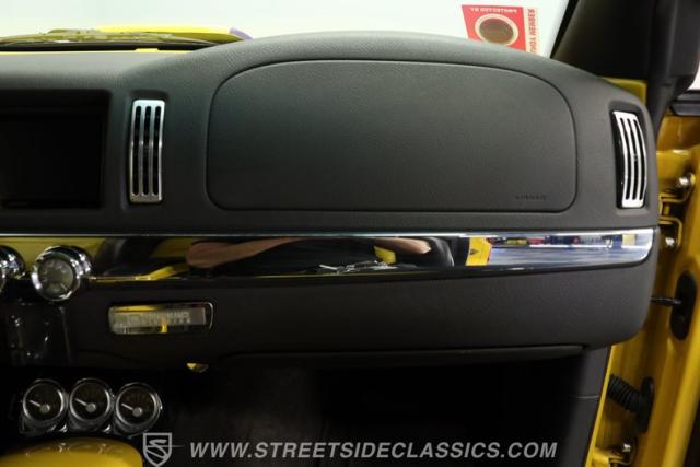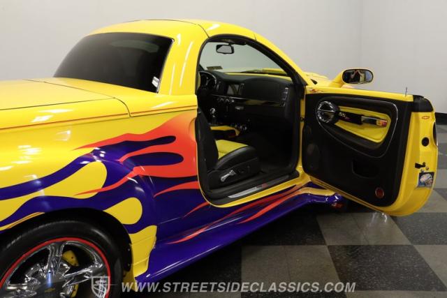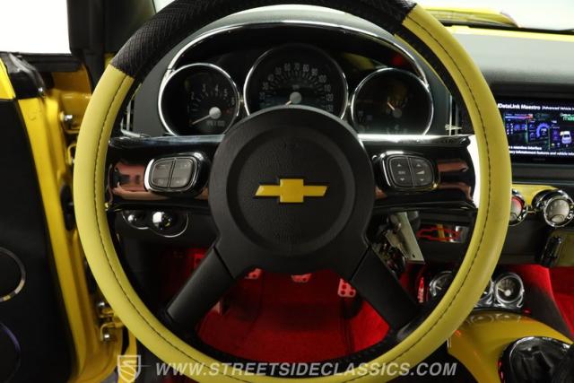 Slide inside and discover a thoughtfully customized interior that perfectly balances comfort and flair. The cabin features custom yellow seat inserts, gleaming chrome accents, and two-tone painted stripes that echo the vibrant exterior. A Kenwood flat screen receiver, red under-dash lighting, and a clean dashboard with clear gauges add a modern touch, while the overall design stays true to the SSR\'s retro-inspired roots. Every detail, from the plush leather seats to the Dale Earnhardt tribute in the bed, ensures your time behind the wheel is as enjoyable as it is memorable.