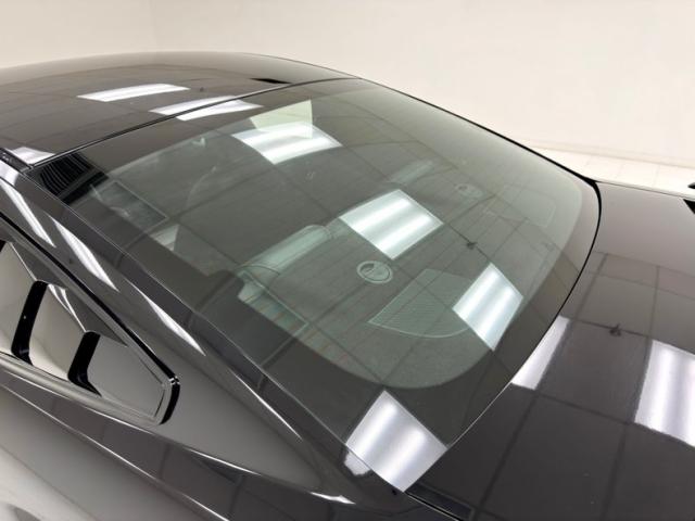 With very little exception, the entire car is bathed in an inky, two stage black paint with seamless bumper covers, a rear wing, and quarter window covers all adopting the flow of black. That darkness makes the red tail light explode off the rear fascia with translucent clarity and the front orange markers standing out, along with the headlights, inboard fog lights, and floating horse on the black grille. Nice wheels add so much to a car and that\'s the case here with 18-inch Bullitt wheels in argent gray, wrapped in staggered size tires with a late 2019 date code, and showing off red brake calipers through the spokes. Imperfections on this low mileage example include some scuffs on the chin and some light staining on the wheels.