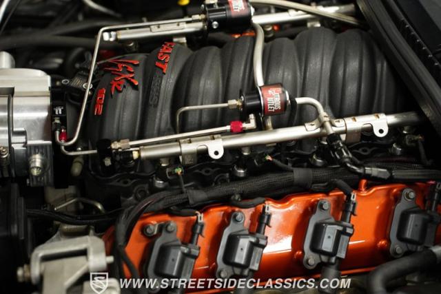 Lurking beneath the carbon fiber hood is a massively upgraded 6.0L LS2 V8, bored .30 over and rebuilt with Wiseco pistons, K1 forged rods and crank. Ported 243 heads, a Tick Polluter cam, and Fast 102mm intake with throttle body work in harmony with GM LS3 injectors. An Airraid cold air intake gulps atmosphere while long tube headers and dual exhaust expel spent gases. A nitrous oxide dry shot system adds extra punch when needed. Power transfers through an RPM-built Level 6 TR6060 6-speed manual to a 3.73 rear axle. Z06 big brake kit handles stopping duties.
