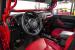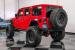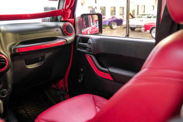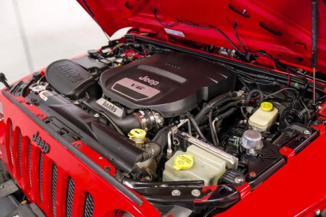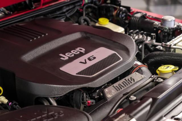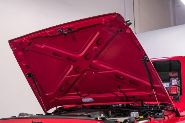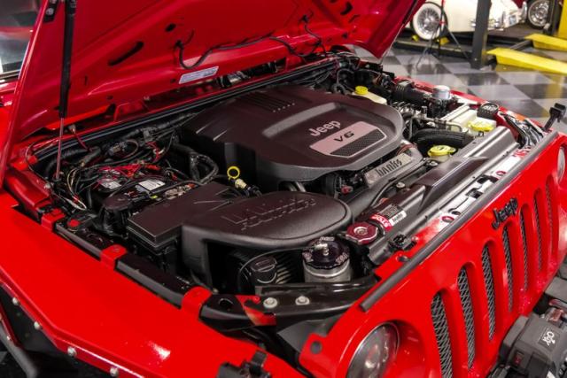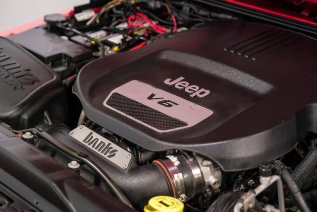 Inside, we find a Rock Hard roll cage with A/B/C pillars surrounding Katzkins eye-catching leather seating. An upgraded sound system with kick panel speakers and an auxiliary amp is in charge of tunes, while a lockable gun safe sits under-seat for an additional type of security system. Under the hood, we find the traditional Jeep PentaStar 3.6-liter V-6 upgraded with a Banks Ram Air cold air intake and Bully Dog programmer with its display mounted to the A-pillar. Power is then routed through a five-speed automatic transmission before being sent out to a set of front and rear Currie Dana 60\'s with electric lockers and 4.88 gears.