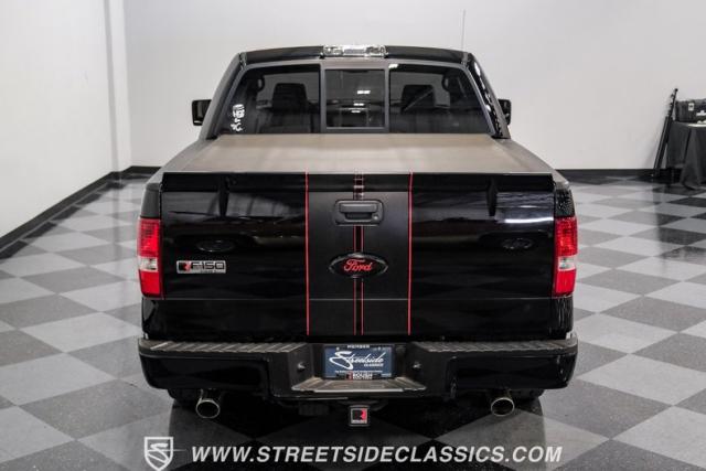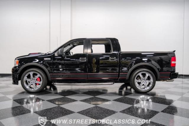 This 2008 Ford F-150 Roush Stage 3 4x4 is a rare breed, a dark horse cloaked in an unassuming black, but with a rumble and performance that hint at its true nature. Its black exterior, complemented by striking Roush 22\" rims and 285/45R22 Nexen tires, presents an imposing figure. Special touches like the sunroof, blacked-out grille, spoiler on the tailgate, and side rails for easy access not only add to its aesthetic but also to its functionality. The tool box on the left side of the bed and the roll-up bed cover enhance its practicality, making it clear this isn\'t your average F-150.