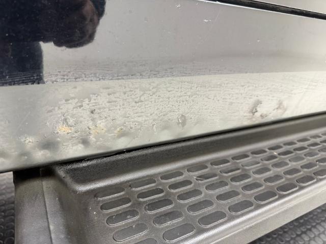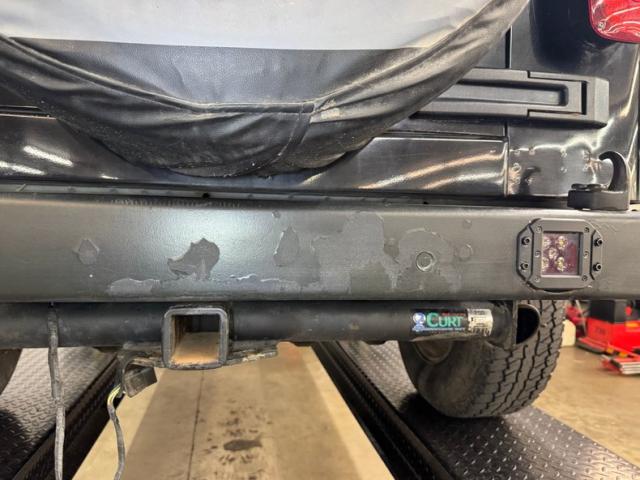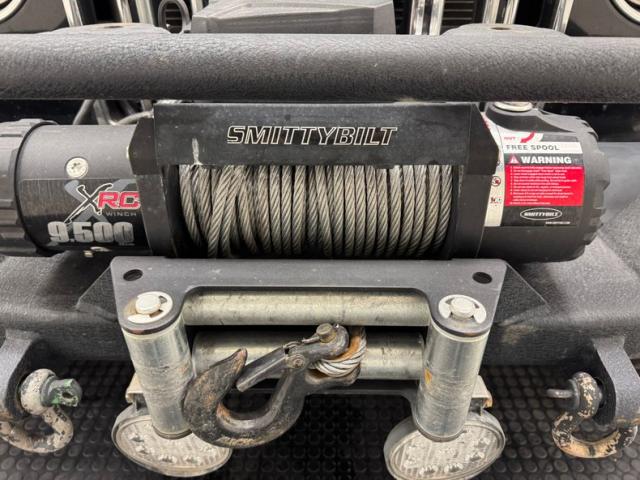 Well sure, it\'s Black, but it\'s that front bumper that grabs your attention with more utility than a Swiss Army knife! Large D-ring shackles lead the way with large fog lights next door, under the Smittybilt 9500 winch and cable protected by a bull bar, finally giving way to the infamous 7 slot grille, here lined with chrome. Matte black stripes ascend over the hood only to be flanked by two more lights, spotlights on the A-pillars. This really is a two parter with the Rally top, meaning the roof comes off targa style over the front occupants while the rear section is also removable and has a roof rack. Out back, tow hooks, a trailer hitch, and added LED lights are on board for late night rescues. It wouldn\'t be a real Jeep without some outdoor bruises and imperfections including some blistering and dimples above the side step and peeling paint on the rear bumper.