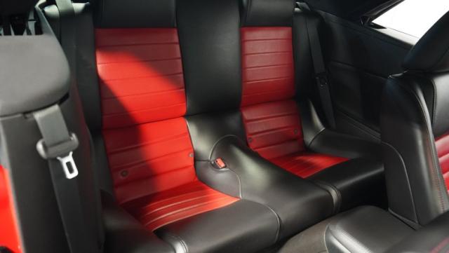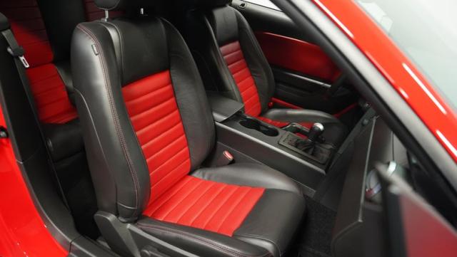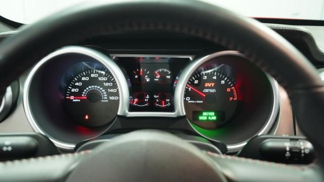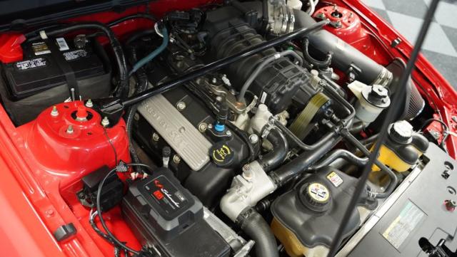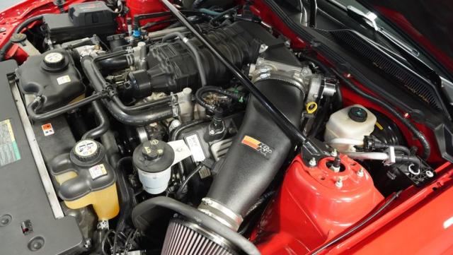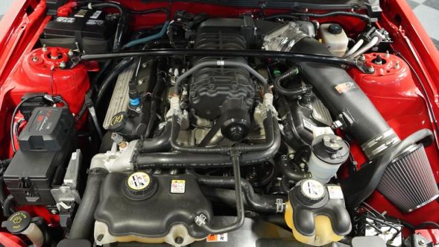 Under the functional scooped hood, we find a massive 5.4-liter supercharged and intercooled V-8 upgraded with a K&N intake. In stock form, that blown small block made 500 hp and 480 lb-ft of torque, making it more powerful than any Mustang that came before it. That power is then channeled through a Tremec TR-6060 six-speed manual transmission before being sent out to the rear axle housing 3.31 rear gears. Stock 18-inch rims shod in 255/45ZR-18 front and wider 285/40ZR-18 rear Goodyear Eagle F1 Supercar tires.