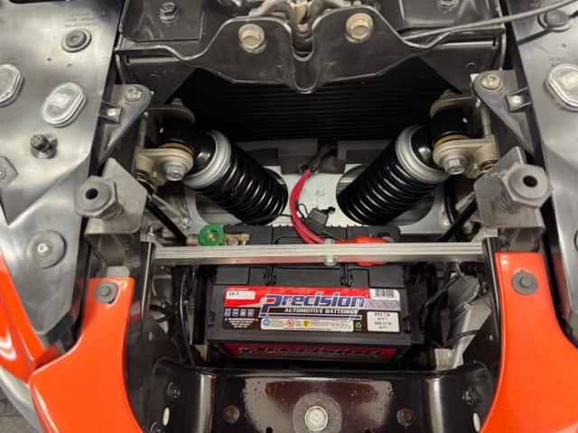A chrome grate over the transmission cooler sets the stage for a clean underside where parts of the dual exhaust shine with mirror-like stainless steel. Coil over suspension is found front and rear and power disc brakes also bring us into the 21stcentury and are employed on all four wheels.