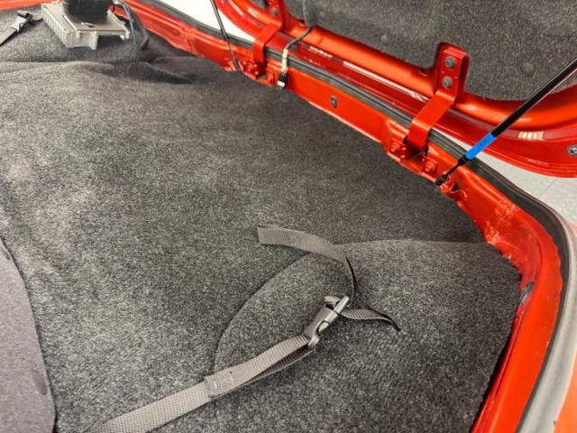 The bad boy exterior gives way to a clean and practical interior that starts with smooth door panels dressed in black plastic and leather, here with custom aluminum faceplates. Padded and stitched leather bucket seats reveal a bit more style with rollbar style tops and the Prowler, a big cat of some kind, embossed on the seat back. That cat shows up again on the steering wheel which is leather wrapped and shares the column with an AutoMeter tachometer. The factory gauge cluster is housed in a color keyed skateboard shaped plastic housing in the center of the dash, old school hot rod style. Molded plastic makes up the remaining dash and has an integrated AM/FM/Cassette/multi CD radio with EQ and simple climate controls. A little bit of flash is found on the base plate of the shifter in the center console which is mirror-like chrome surrounding a Hurst shifter, while a built-in cupholder nearby lets you know you\'re not in the 50\'s anymore. Low pile charcoal carpet nicely covers the floor, protected by Prowler mats with orange writing, and carpet covers the rear canvas top storage space.