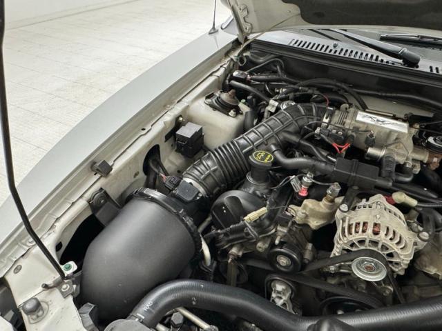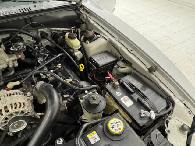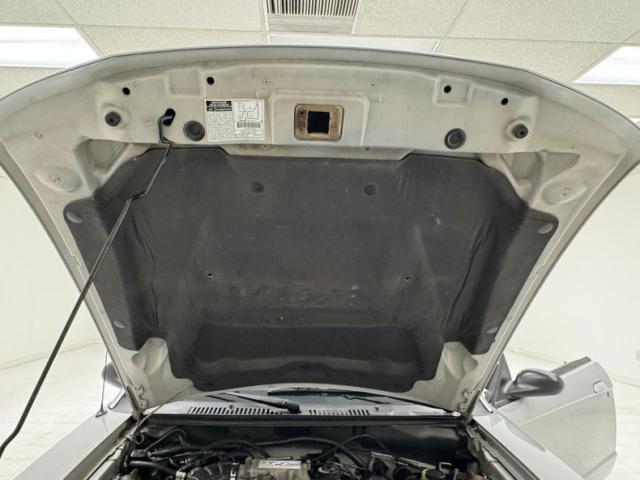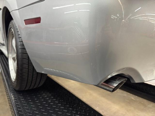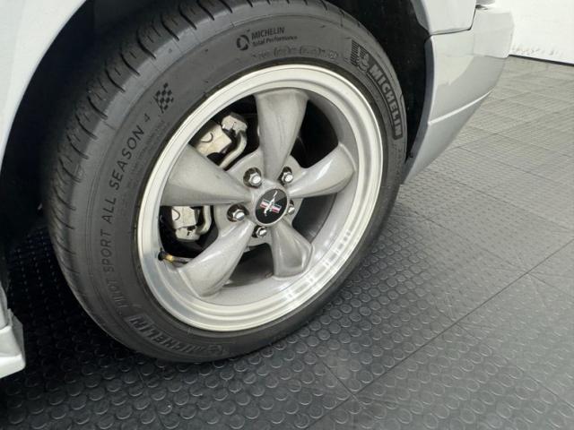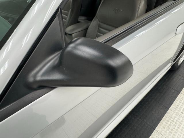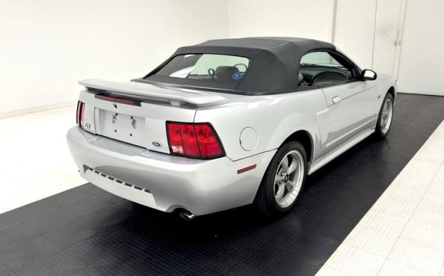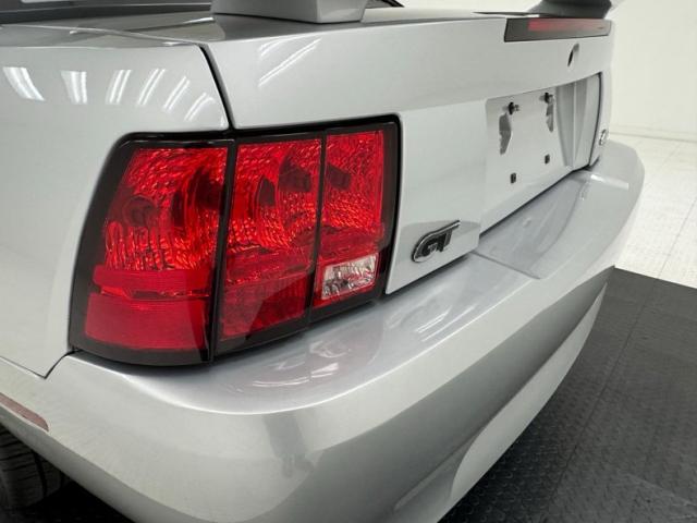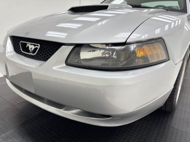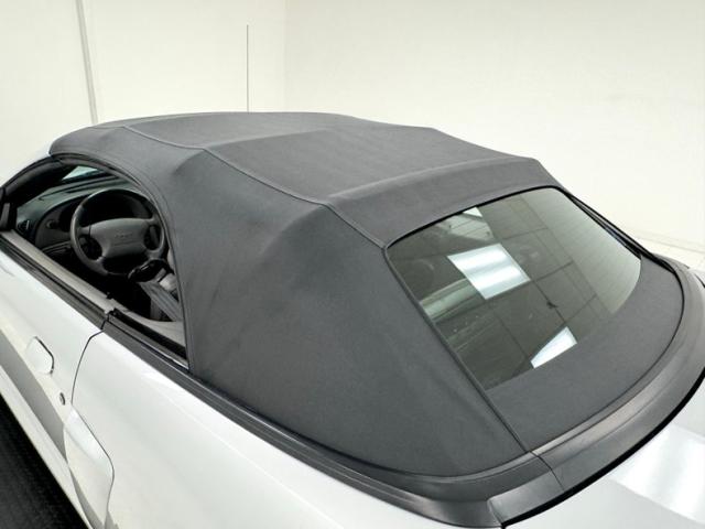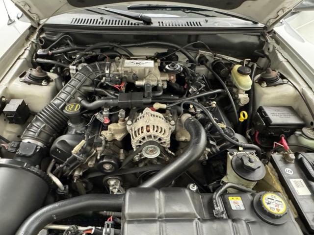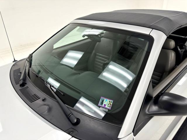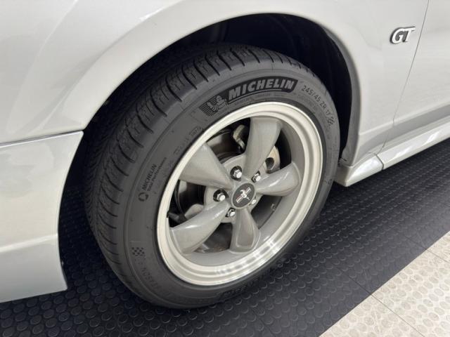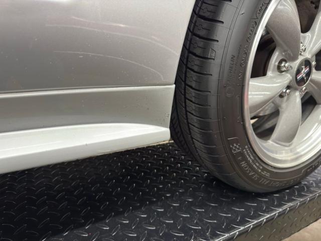 More than 138,000 Mustang GT\'s were built in 2002 and this one left the factory in Satin Silver Pearl paint, a fantastic neutral color offset by the black features of the car which includes the canvas soft top. Flush headlights give the car a slightly aggressive grin augmented by the fog light integrated into the chin spoiler and the scoop on the hood. 17-inch Bullitt wheels in argent with a polished rim also look great and are wrapped in 245/45ZR17 tires with a mid 2024 date code. The tidy tail of the car carries flush mounted tail lights with their heritage three sections over a smooth bumper cover and some wind splitting slits in the valance along with cut outs for the dual exhaust tips. Overall, the paint is in good shape with imperfection notes as rock chips and scratches on the lower and rocker panels, touches up chips, random scratches, a scuff in the lower cladding, blemishes on the hood, and a crack in the cowl panel.