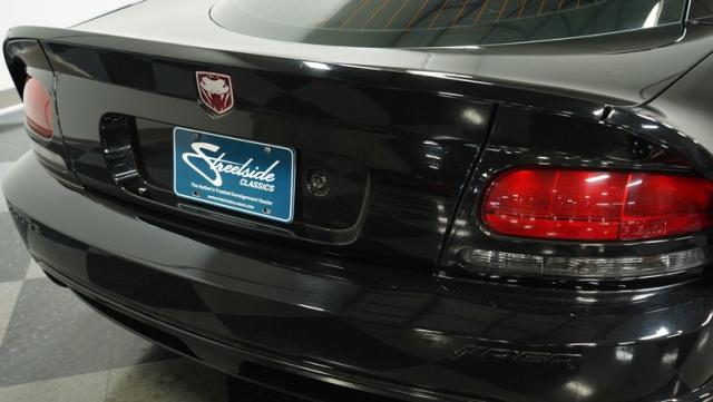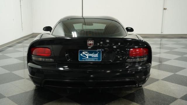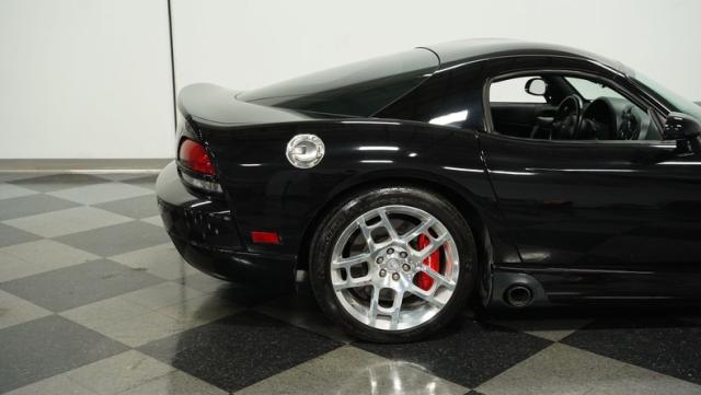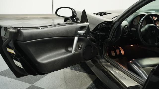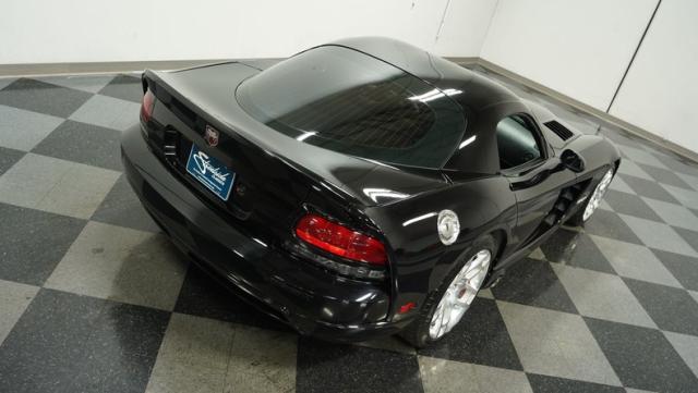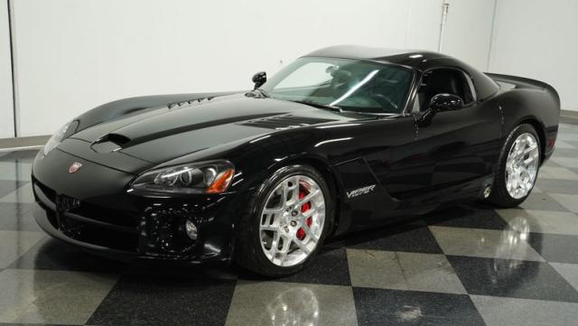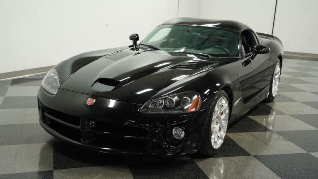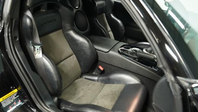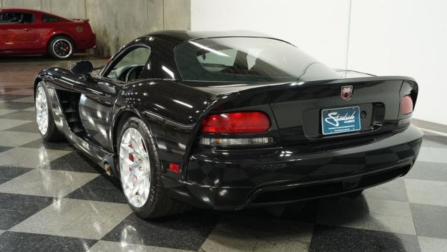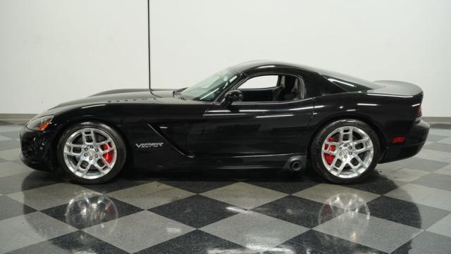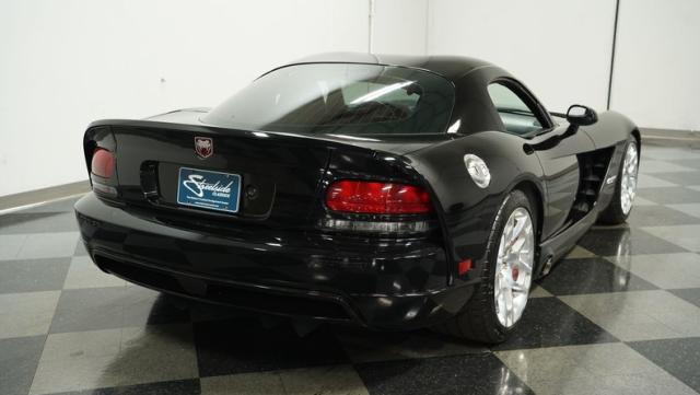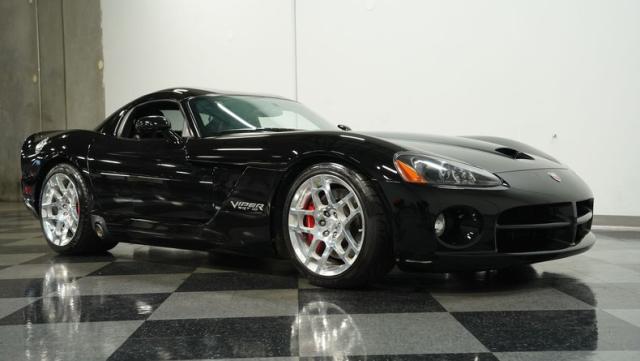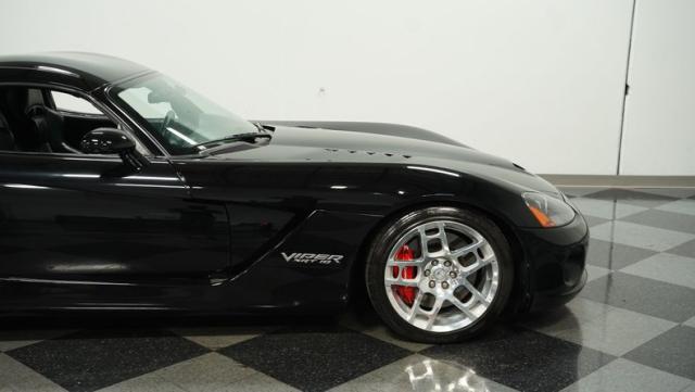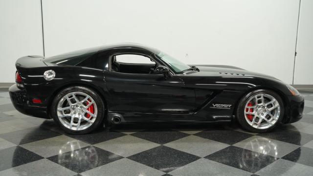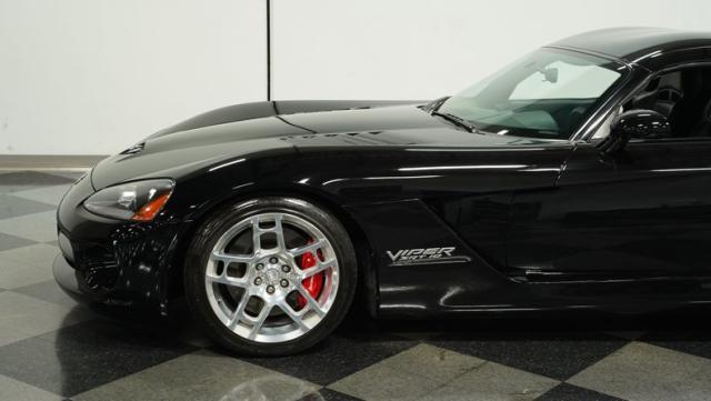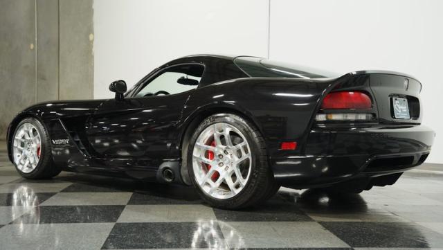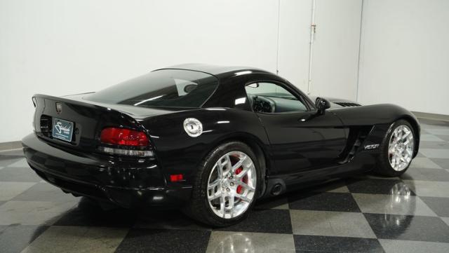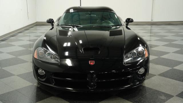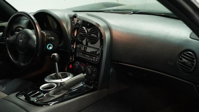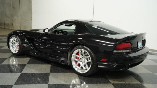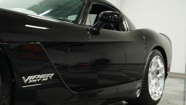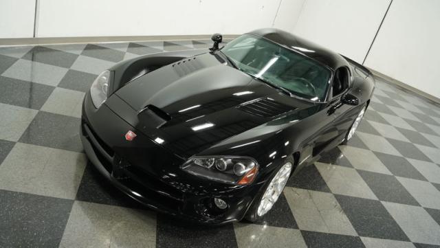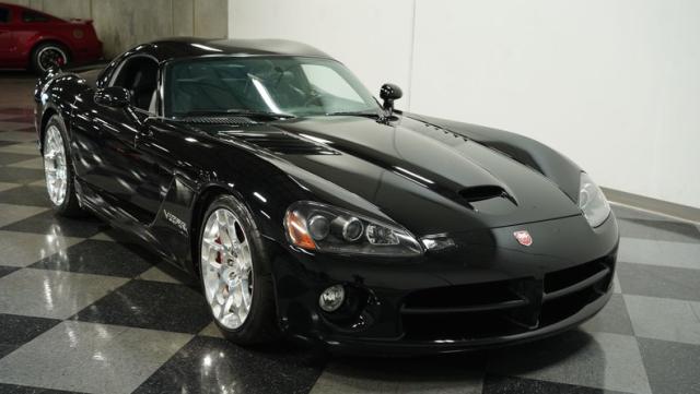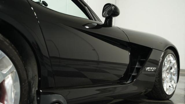 This 2006 Dodge Viper SRT-10 Coupe, enshrouded in the deep, mystic allure of Viper Black, is the embodiment of sheer muscular fortitude and unchained ferocity. Its sleek paint, safeguarded by a protective film on the fenders, front bumper, and hood, mimics the dark canvas of the night, waiting for lightning to strike. Resting on 18\" and 19\" wheels at the front and back, shod in 275/35ZR18 and 345/30ZR19 tires respectively, this predator is rooted to the ground, ready to pounce. Stripped of stripes, its dark silhouette, complemented by side pipes whispering promises of power, channels the menacing presence of a night hunter.