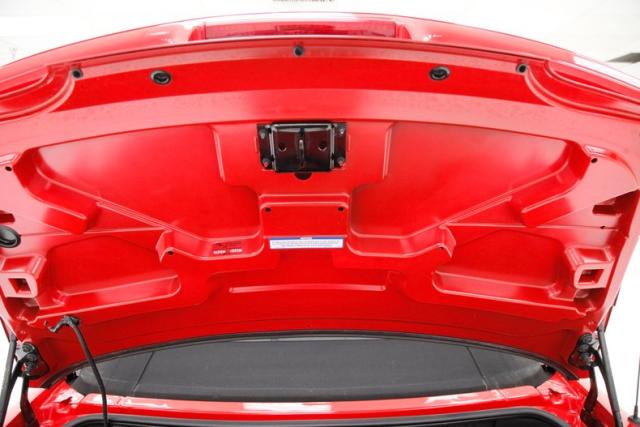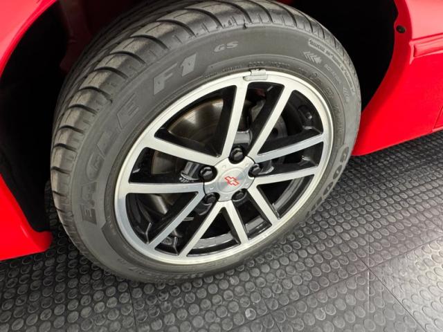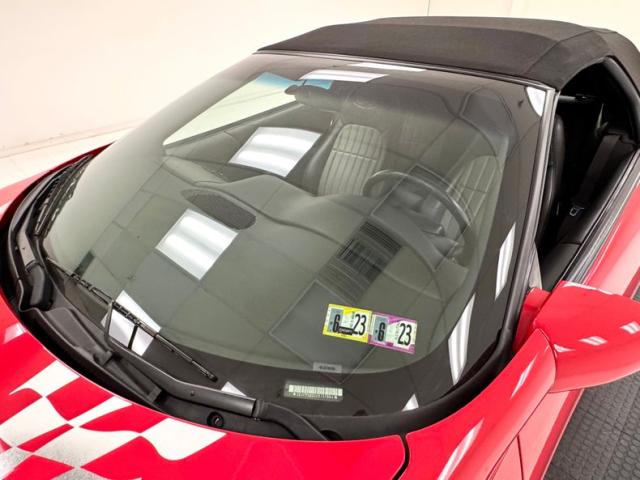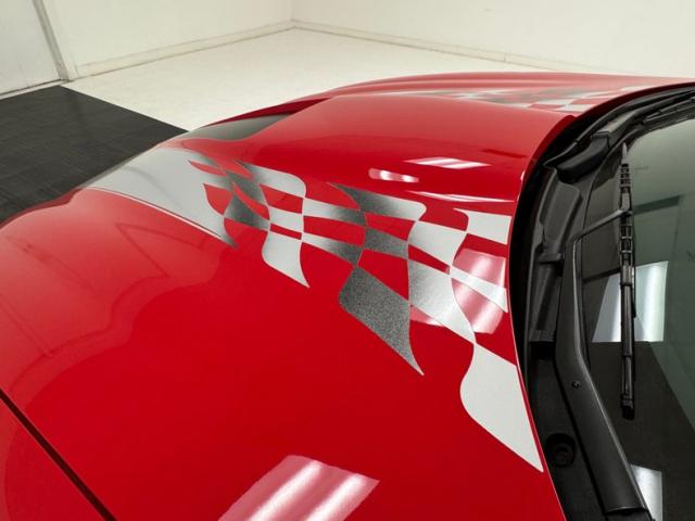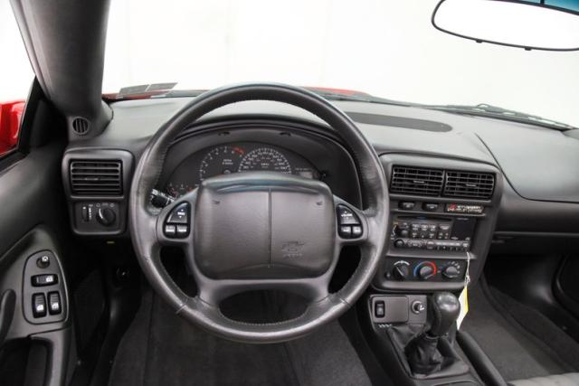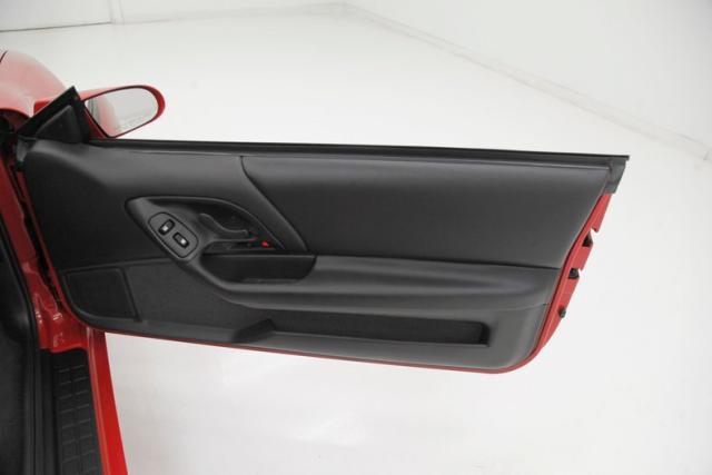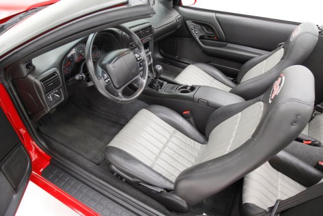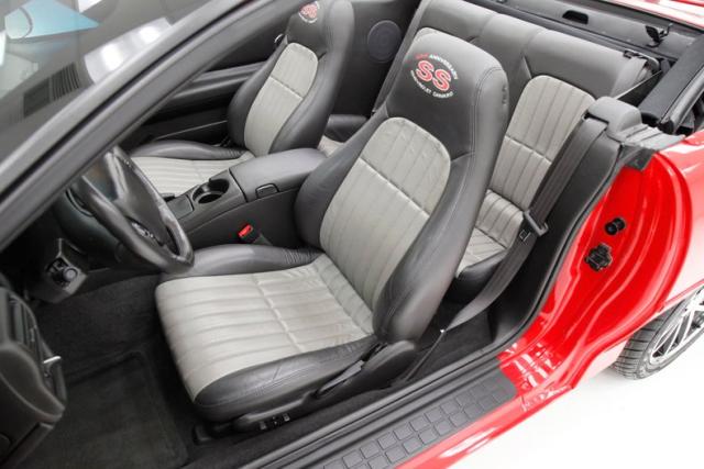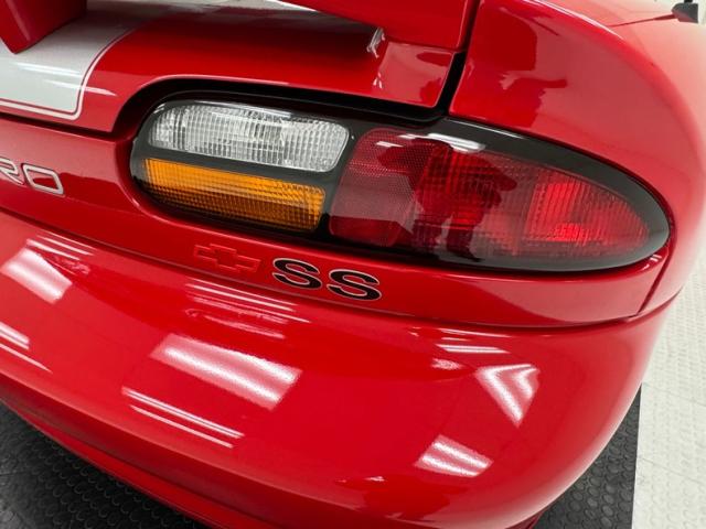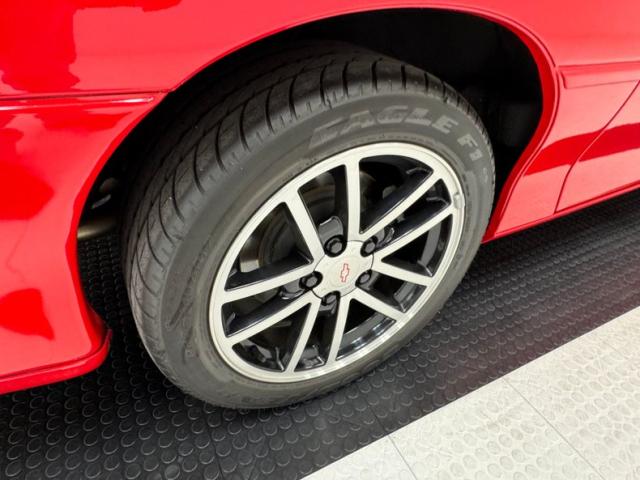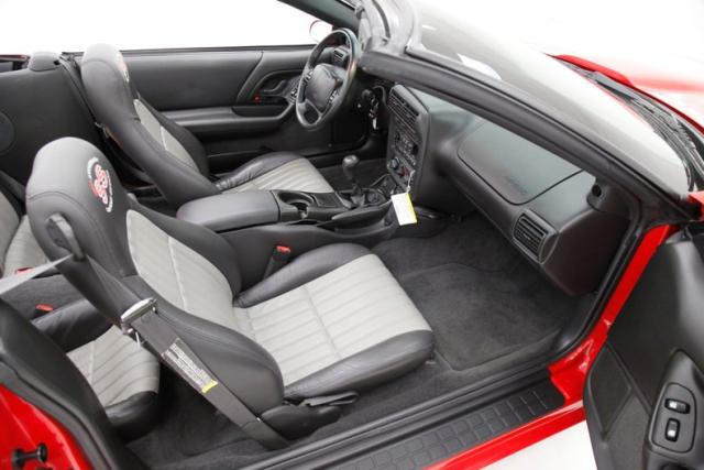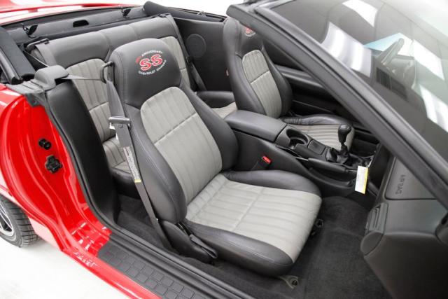 This car screams SLP and anniversary options with it all bathed in Bright Red. The front grille is slightly modified and has dual wide white racing stripes starting at the bottom of the front spoiler and moving towards the windshield where at the hood scoop it splits and fades into a checkered flag. The grille is slightly different, and an SS badge is neatly put in the very low center of said grille. Chevrolet is known for their rakish styling on the front glass, and this car is no exception with that windshield leaning way back in this design. On top is a nice black canvas convertible, all clean and sporting a rear glass window. On the sides, straight steel and high impact plastic with well minded gaps creates the front and rear quarters, (badged with 35th anniversary badges BTW!) and doors. The wide stripes continue on the rear deck where there is a SS specific wide spoiler that is very low profile. 17\" 10 spoke SS specific aluminum wheels are on all 4 corners. Dual exhaust peek out from under the center of the body matching neoprene bumper. All paint is at the deep end of the pool and looks showroom perfect throughout.