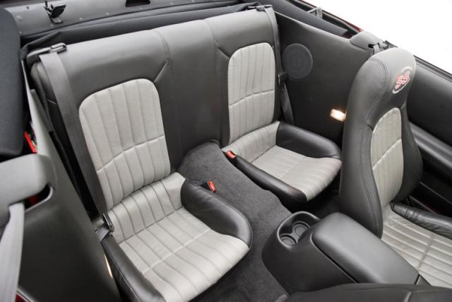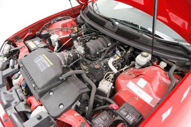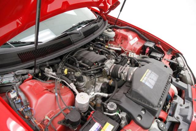 A swing of the sexy doors and we get loads of Ebony molded smooth vinyl, integrated door pulls with a matching charcoal gray actuator and plenty of power toggles to play with. Inside 2 tone gray leather high back buckets showing slight wear that comes from age and very little use have the SS 35th Anniversary logo embroidered into the headrests and on the lighter inserts we see nothing but clean supple leather. A center console undulates by these buckets and houses the shifter for the automatic transmission. Shoehorned in back are two more molded in two tone buckets with not a lot of legroom but they are there. The center of the dash rises to the occasion with a premium sound system including AM/FM/CD (an optional 12-disc CD changer is mounted in the hatch area), climate controls, and an ASR, (traction control), button. A beautifully and gracefully arched dash top in front of the driver has all the essential gauges and warnings should something go awry during your performance drive. Charcoal gray carpeting floods the floors and is protected by color matching carpeted mats.