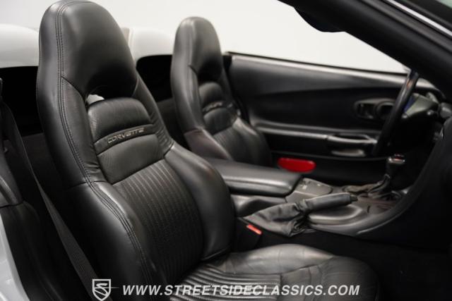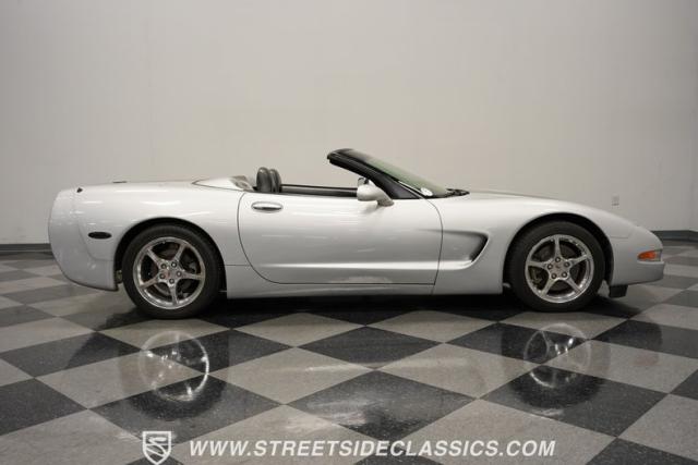 Sleek curves and aerodynamic lines flow across this 2000 Chevrolet Corvette Convertible in its Silver Metallic finish. Custom decal stripes run along this sports car, adding a personalized racing-inspired accent against this silver background. When adventure calls, this black cloth convertible top folds away for an open-air driving experience. Chrome wheels - 17 inches up front and 18 inches in the rear - give this Corvette a well-planted look. Wide 245/45ZR17 front and 275/40ZR18 rear tires connect firmly with the pavement, highlighting this vehicle\'s performance capabilities.
