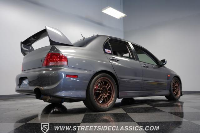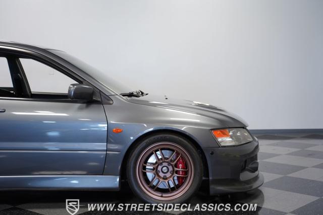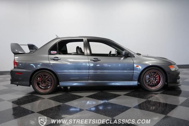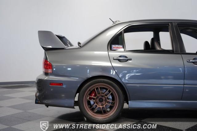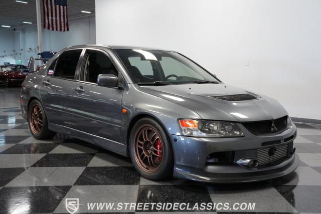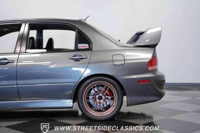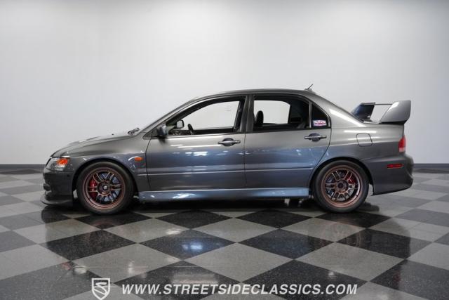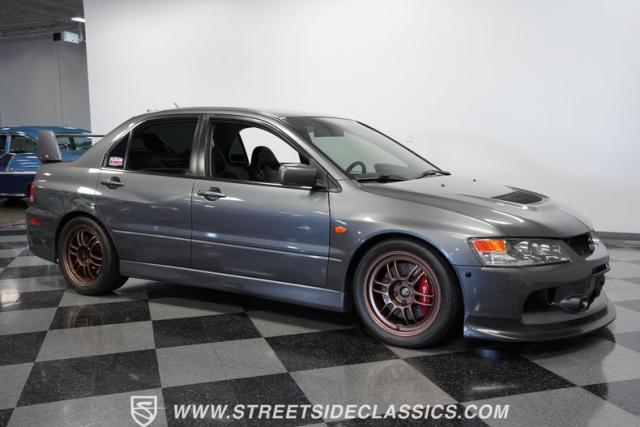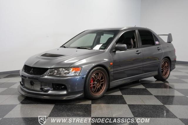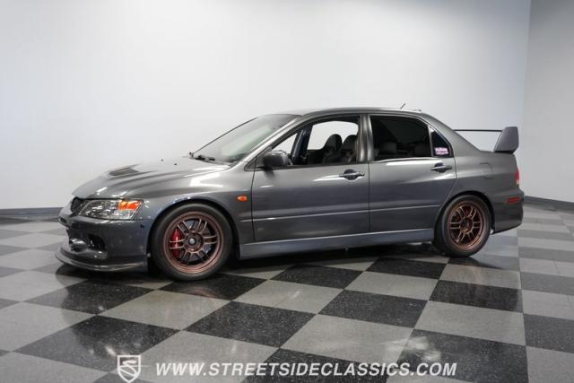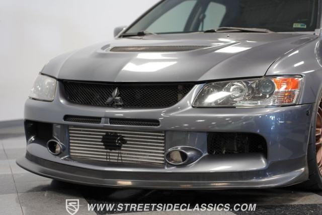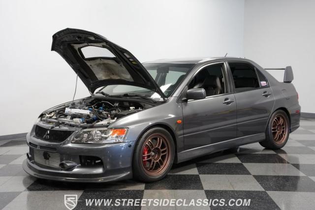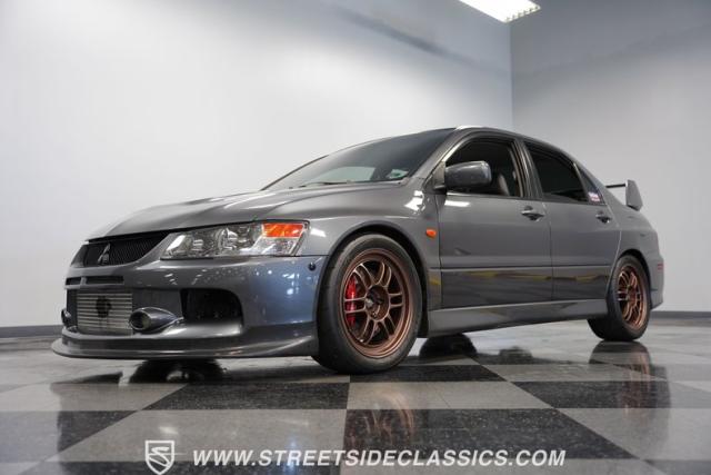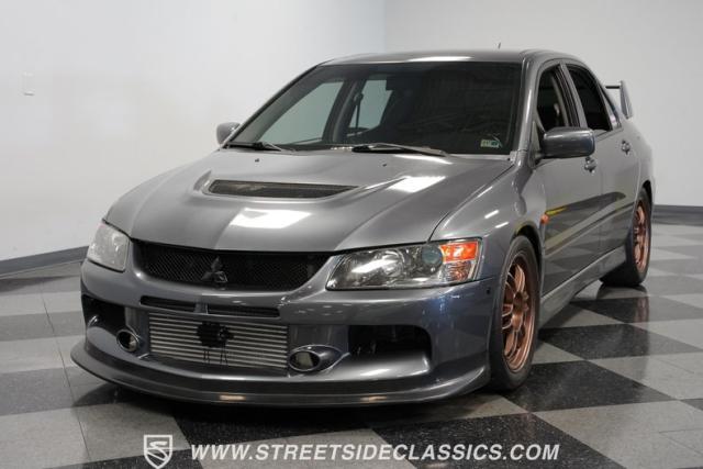 This 2006 Mitsubishi Lancer Evolution, a rally-bred machine, showcases its aggressive stance in dark silver metallic. The Evo\'s iconic design is enhanced with a functional hood heat extractor, signaling the potent engine within. Its aerodynamic profile is accentuated by a large \"whale tail\" spoiler and rear window wind diffuser, while the de-badged decklid adds a clean, purposeful look. Riding on bronze metallic 17-inch wheels wrapped in Toyo Proxes tires (245/40ZR17 front, 245/45ZR17 rear), this Evo commands attention with its track-ready appearance. The aggressive front bumper, grill, and dark-tinted windows complete the car\'s menacing aesthetic.