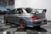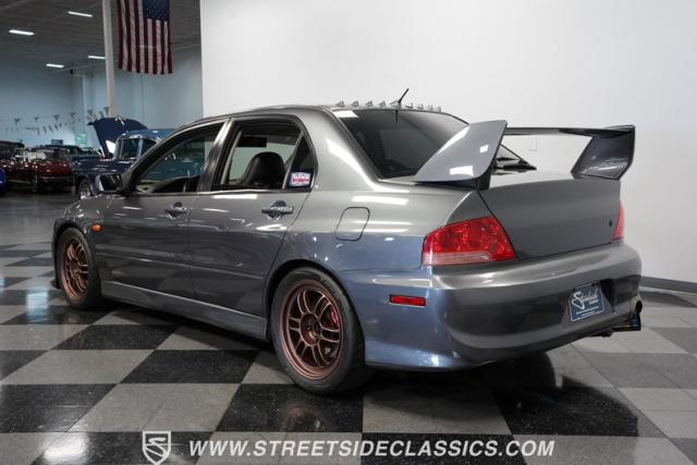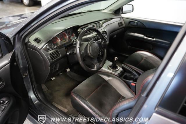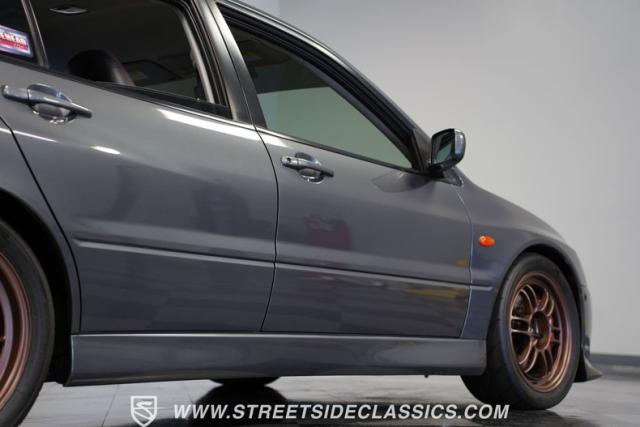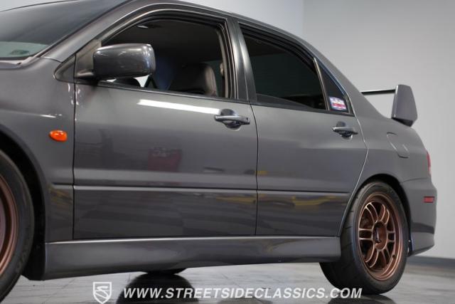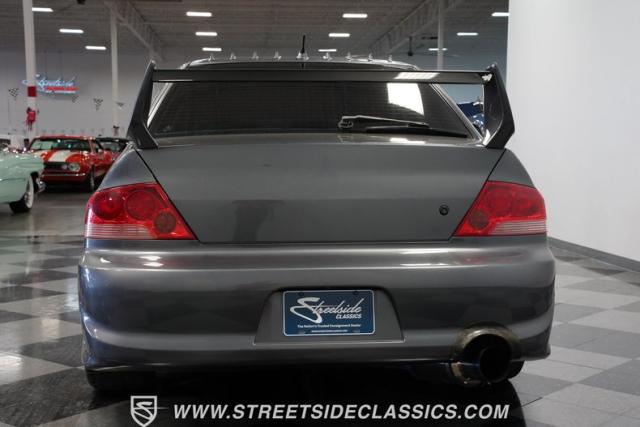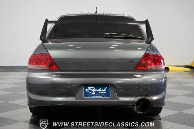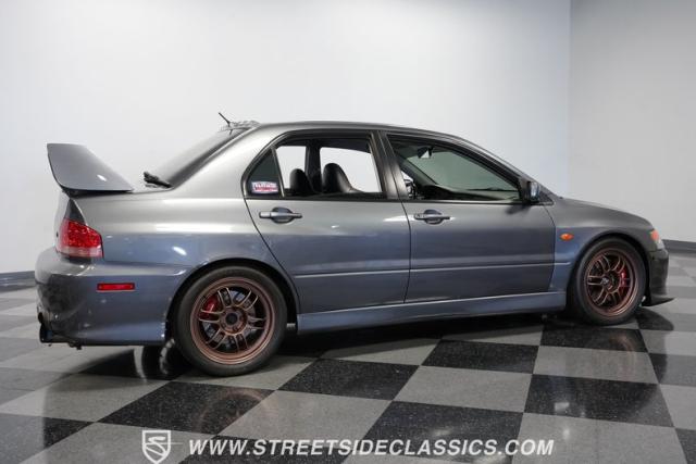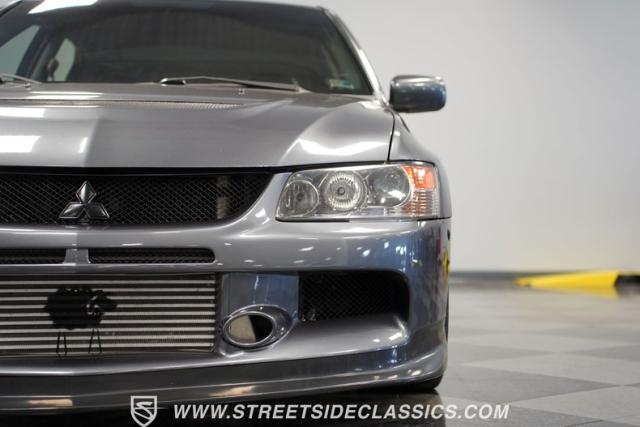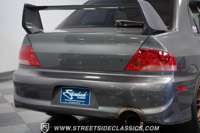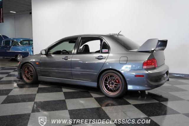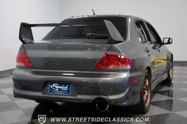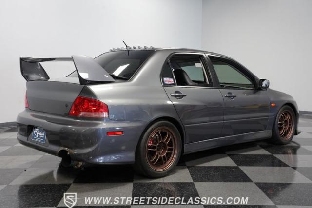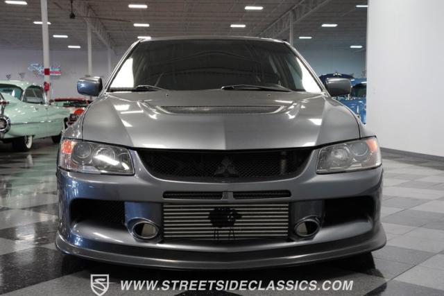 This 2006 Mitsubishi Lancer Evolution, a rally-bred machine, showcases its aggressive stance in dark silver metallic. The Evo\'s iconic design is enhanced with a functional hood heat extractor, signaling the potent engine within. Its aerodynamic profile is accentuated by a large \"whale tail\" spoiler and rear window wind diffuser, while the de-badged decklid adds a clean, purposeful look. Riding on bronze metallic 17-inch wheels wrapped in Toyo Proxes tires (245/40ZR17 front, 245/45ZR17 rear), this Evo commands attention with its track-ready appearance. The aggressive front bumper, grill, and dark-tinted windows complete the car\'s menacing aesthetic.