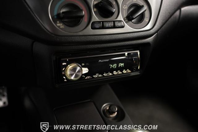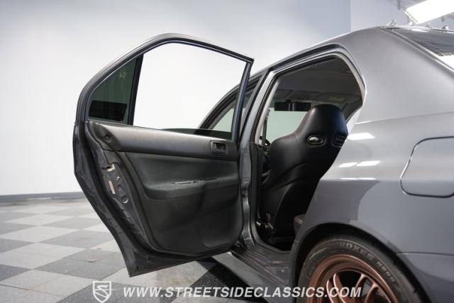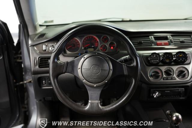 Inside, the Evo\'s interior blends performance with comfort. Black Recaro race bucket seats, a mix of leather and cloth, offer excellent support for spirited driving. The dashboard features carbon fiber accent trim, lending a high-tech feel to the cockpit. A Momo steering wheel and three auxiliary gauges mounted above the AC controls provide the driver with crucial information. The Pioneer CD radio and oversized Broadway rearview mirror add modern conveniences to this performance-focused interior.
