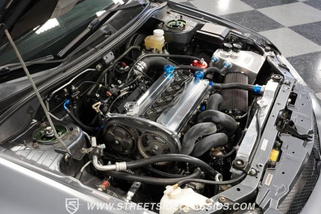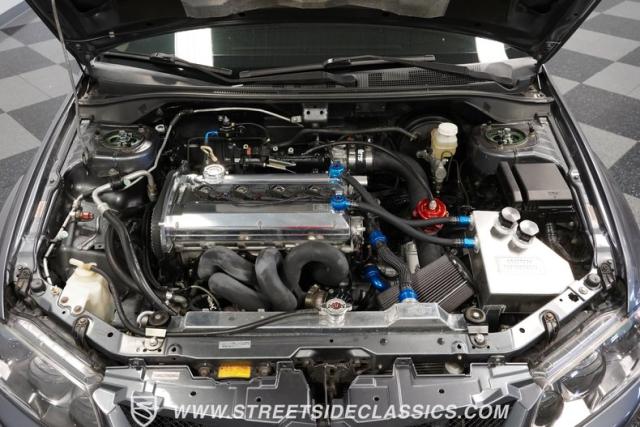Under the hood, this Evo houses a heavily modified powerplant. The 2.2-liter destroked engine, built by Buschur Racing, features a 4G64 shortblock with Manley forged internals and a compression ratio of 10.5:1. The Stage 3 OEM Evo9 cylinder head is extensively modified with CNC porting and GSC Power Division Billet Evo9 Mivec stroker R2 camshafts. A Precision Turbo 6466 provides the boost, controlled by dual Tial MV-S 38mm wastegates and a Grimspeed boost controller. A front-mount Sheepy Race Intercooler keeps the charged air cool. Power is managed by a Link ECU, allowing for precise tuning. The drivetrain is fortified with an aftermarket driveshaft to handle the increased power output.