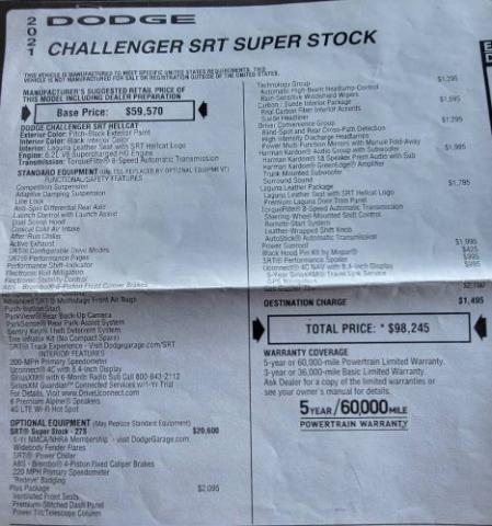 2021 Dodge Challenger SRT Hellcat Super Stock with pitch black exterior paint. Black interior Laguna leather seats with the SRT hellcat logo. 6.2 l, V8 supercharged HO engine with torque flight 8 speed automatic transmission. All equipment listed can be seen in last picture. Balance of 5 yr./60000 mile powertrain limited warranty. ***Please Note The Following **Vehicle Location is at our clients home and Not In Cadillac, Michigan. **We do have a showroom with about 25 cars that is by appointment only **Please Call First and talk to one of our reps at 231-468-2809 EXT 1