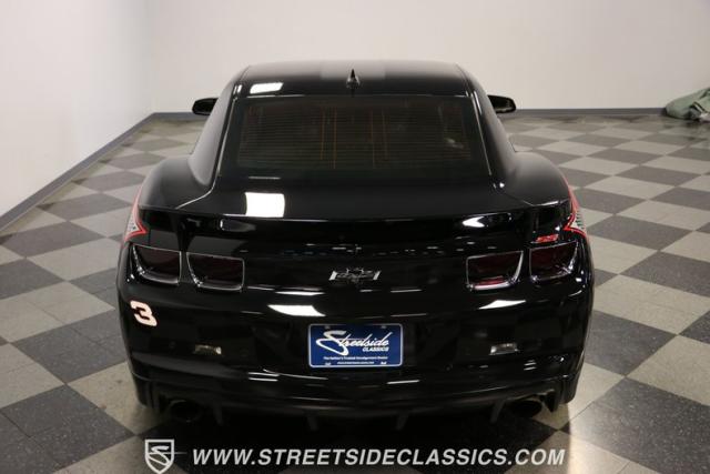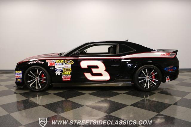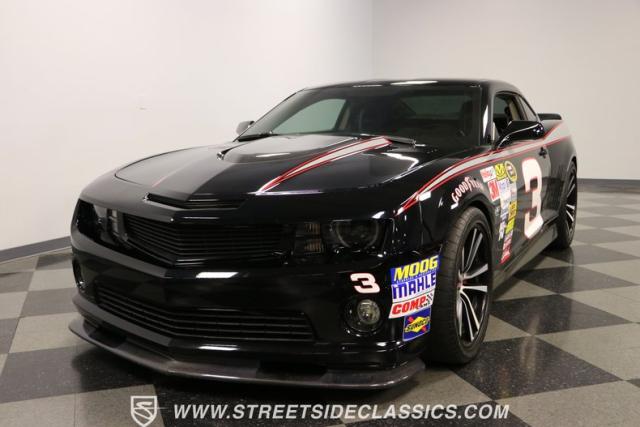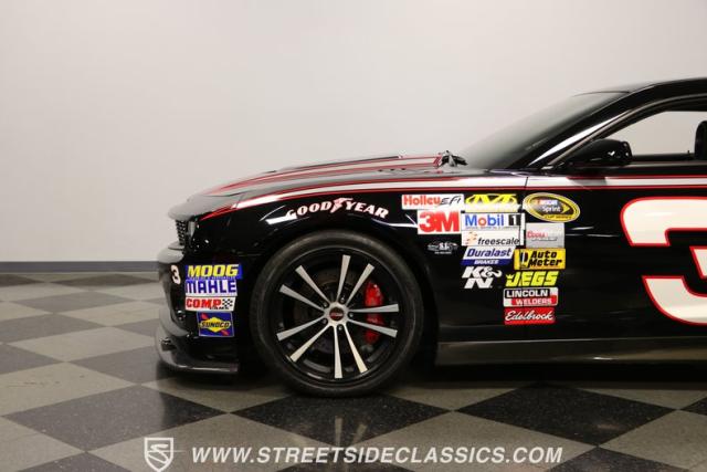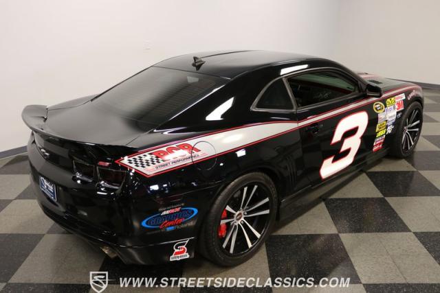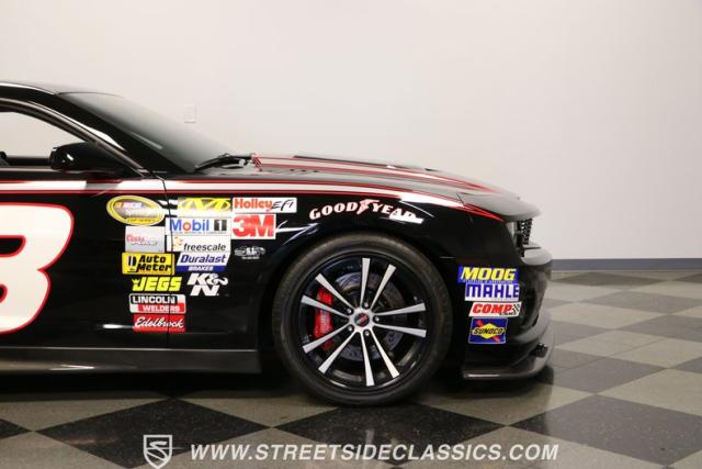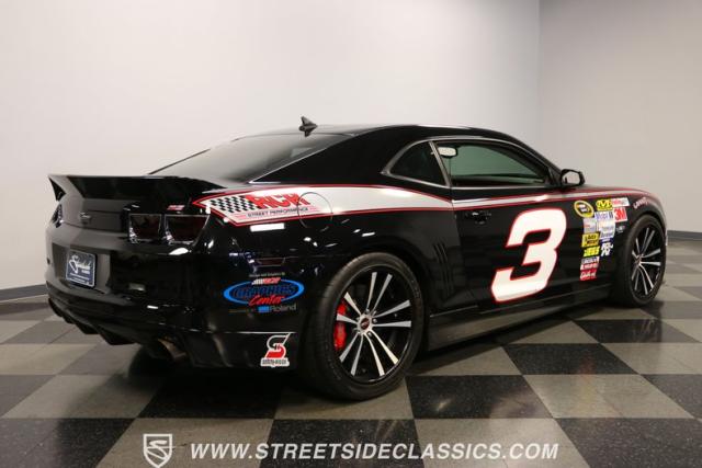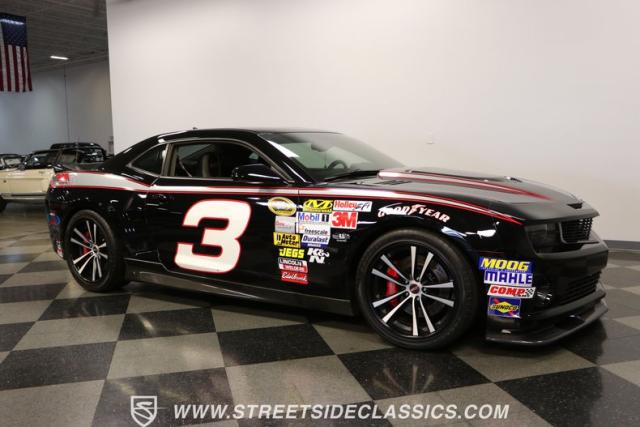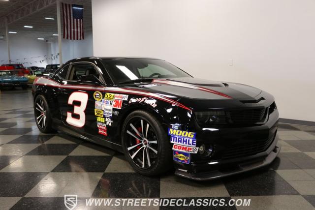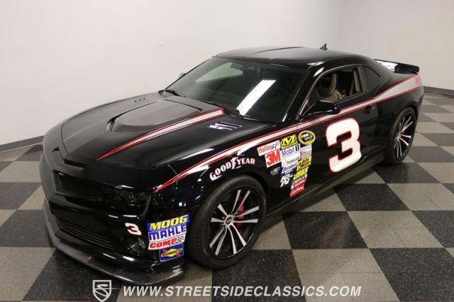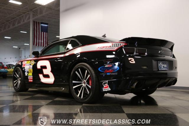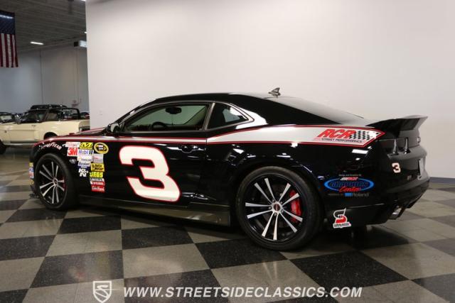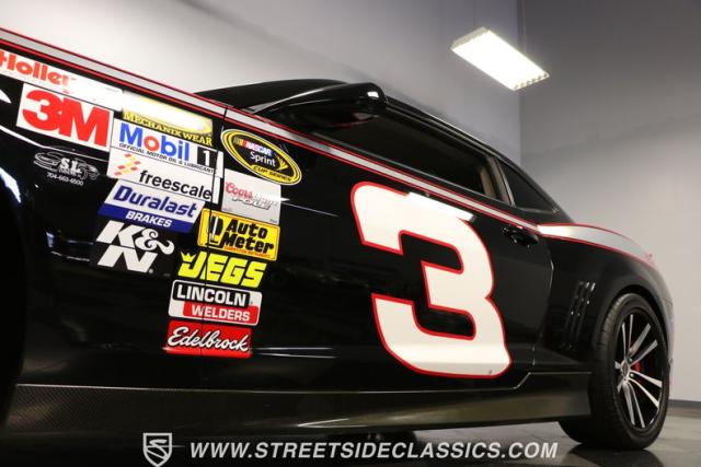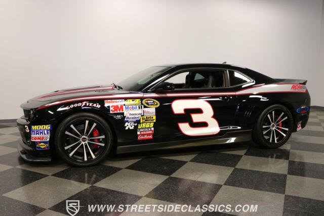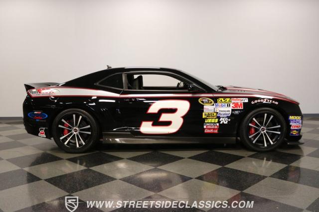 Richard Childress Racing (RCR) is just as much a keeper of the Dale Earnhardt legacy as Dale Jr (that\'s why they both signed the dash.) That\'s why this special Camaro looks so right with a tribute to The Intimidator. The color theme is a sleek factory back with silver accents and red perimeter striping. So it doesn\'t need a big #3 on the door or all those classic sponsor decals to already let you know this one is doing it for Dale. And more than an awesome race car color package, this one earns its intimidation with a prominent chin spoiler, blacked-out grille, NASCAR-inspired rear spoiler, blacked-out tail lights, and a custom sculpted style hood. RCR even has its own set of unique 20-inch alloys that let you get a nice look at the complete brake package within. And everything looks so clean because this car has less than 18k miles. In fact, you know they kept it to quite a high standard because the car was a promotional piece and won its class at the 2013 Detroit Autorama.