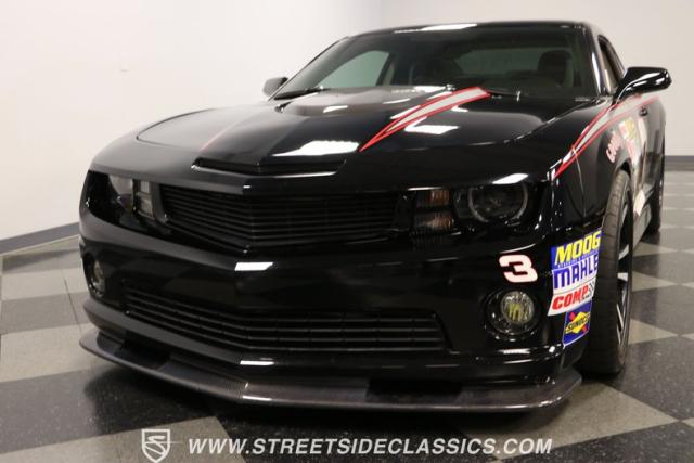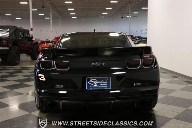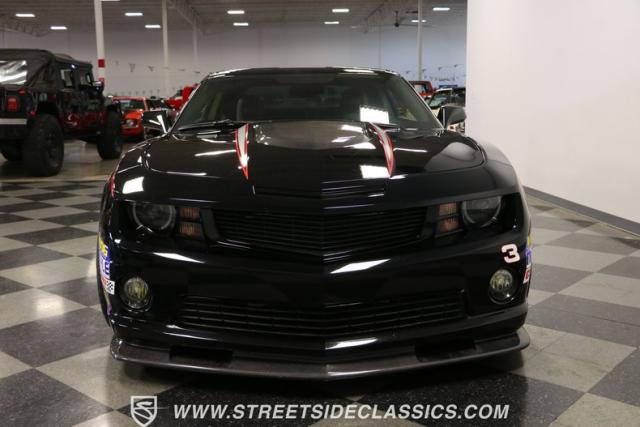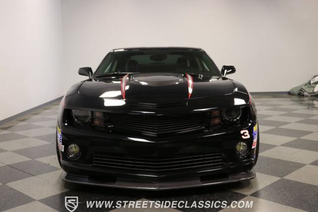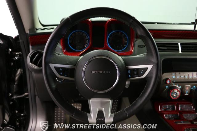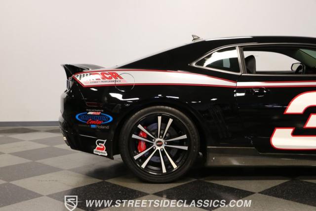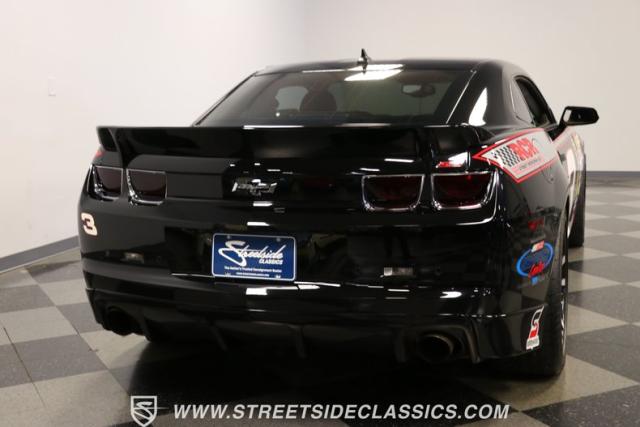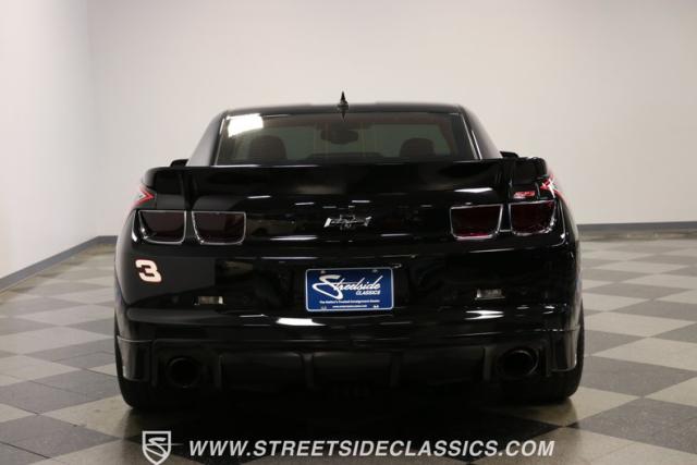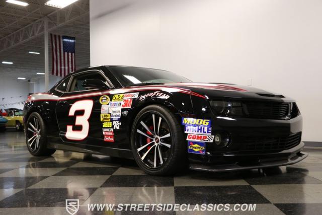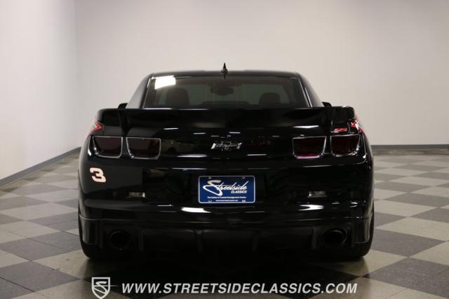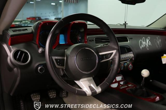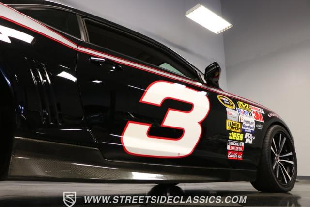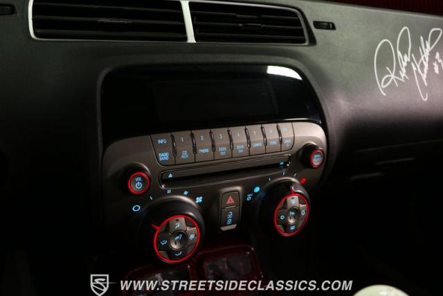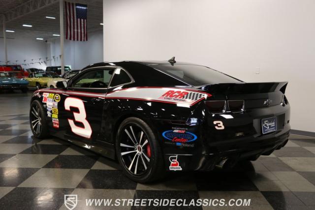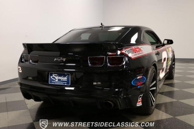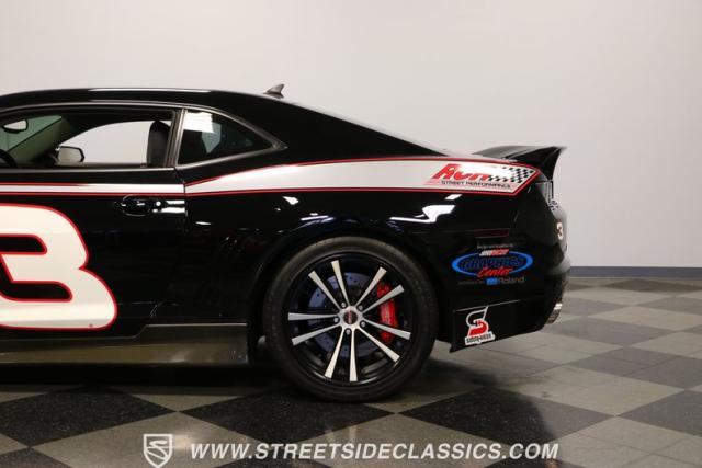 Richard Childress Racing (RCR) is just as much a keeper of the Dale Earnhardt legacy as Dale Jr (that\'s why they both signed the dash.) That\'s why this special Camaro looks so right with a tribute to The Intimidator. The color theme is a sleek factory back with silver accents and red perimeter striping. So it doesn\'t need a big #3 on the door or all those classic sponsor decals to already let you know this one is doing it for Dale. And more than an awesome race car color package, this one earns its intimidation with a prominent chin spoiler, blacked-out grille, NASCAR-inspired rear spoiler, blacked-out tail lights, and a custom sculpted style hood. RCR even has its own set of unique 20-inch alloys that let you get a nice look at the complete brake package within. And everything looks so clean because this car has less than 18k miles. In fact, you know they kept it to quite a high standard because the car was a promotional piece and won its class at the 2013 Detroit Autorama.