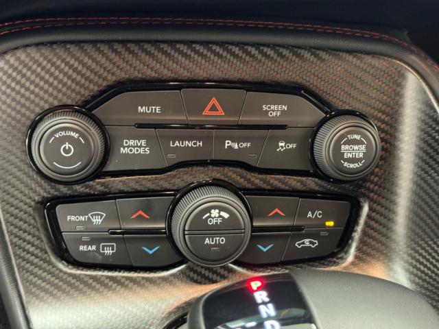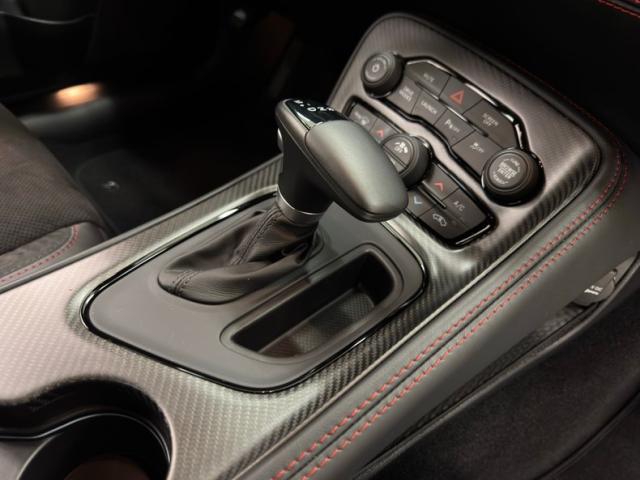 Leather clad door panels are nicely designed and augmented by red stitching and molded plastic that provides lower storage including a contoured cupholder for each front seat occupant. Special seats are demanded by this limited edition, and they are black Nappa leather surrounding Alcantara inserts and the red stitching continues to bolster aesthetics. Seatbelts are supplied with a dark red hue Dodge calls Demonic Red, while the angry bee is depicted in black and white embroidery on the seat backs. A bit less dressy and supportive in back, but they do get the red seatbelts while the steering wheel, dash pad, and center console retain the red stitching. Carbon fiber faceplates surround gauges and the shifter while an 8.4\" screen relays everything from navigation to the functions of the AM/FM radio with Uconnect and XM capability. Tight black carpet below, a padded, suede headliner above, and smooth gray panels in the trunk complete the clean presentation and new car smell!