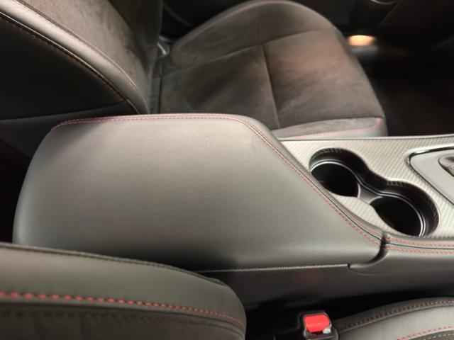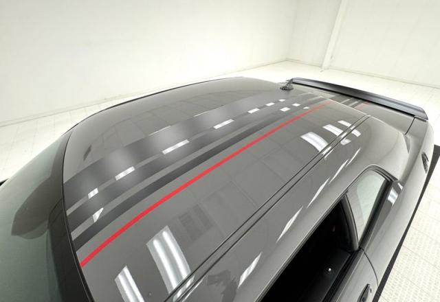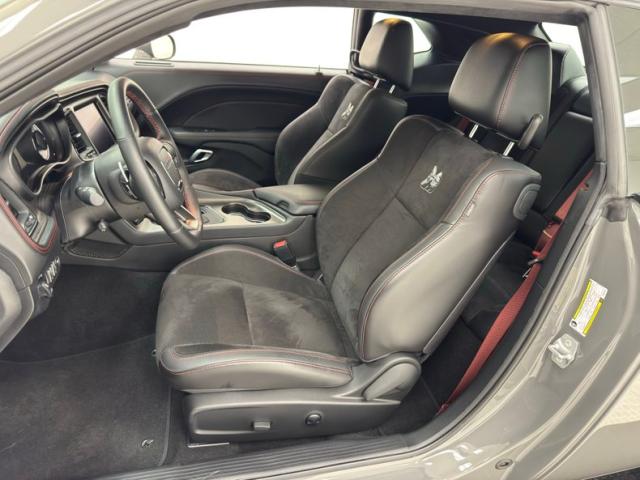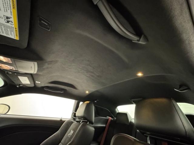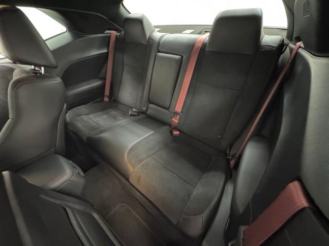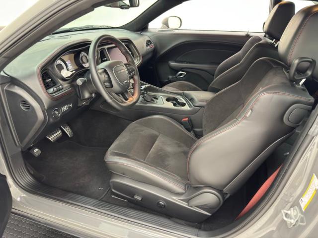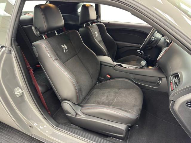The neon yellow spoiler guards first catch your eye, but it\'s the asymmetrical stripe on the hood that draws the eye, with varying width flat black stripes and bright red one sweep around the hood scoop and travel over the roof and decklid, immediately denoting this car as something special. The shaker hood, red 392 decals on the side, and Shakedown spoiler graphic are just part of the package that makes this one unique. Low gloss 20-inch wheels are there too, here wrapped in 275/40ZR20 tires with an early 2023 date code. It\'s hard to miss the red brake calipers behind those wheels, compliments of Brembo. In back, the standard, aggressive fascia remains with piano black panel, elongated tail lights, and exhaust tips that tuck neatly into the valance. This car presents as new and we could not find any exterior imperfections.