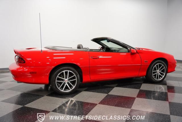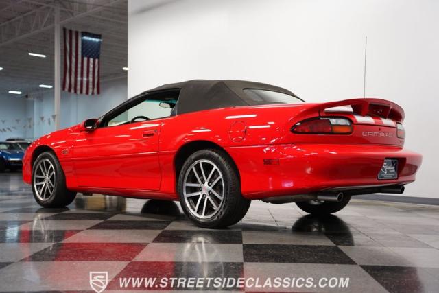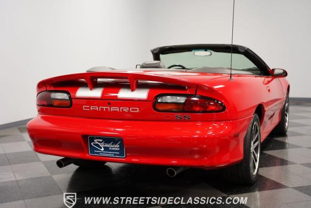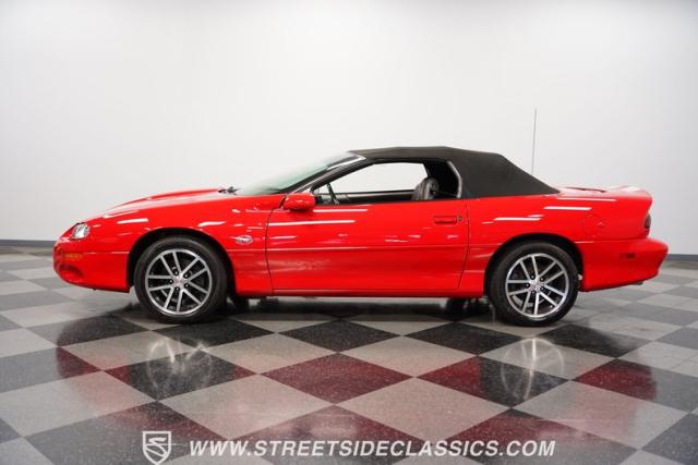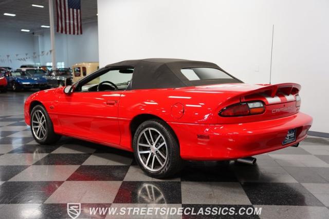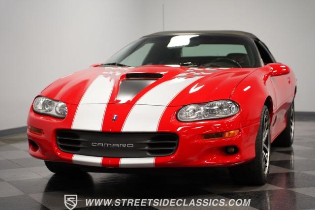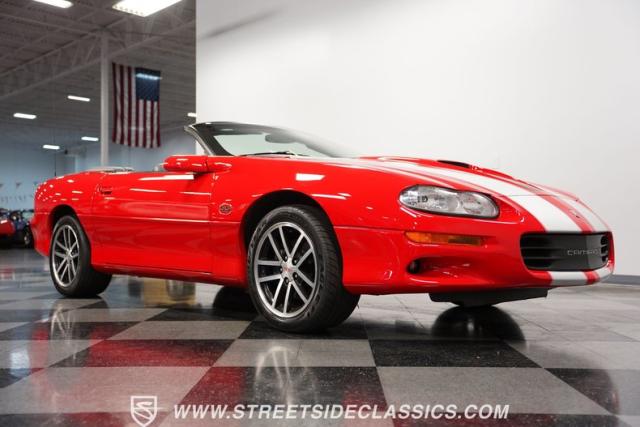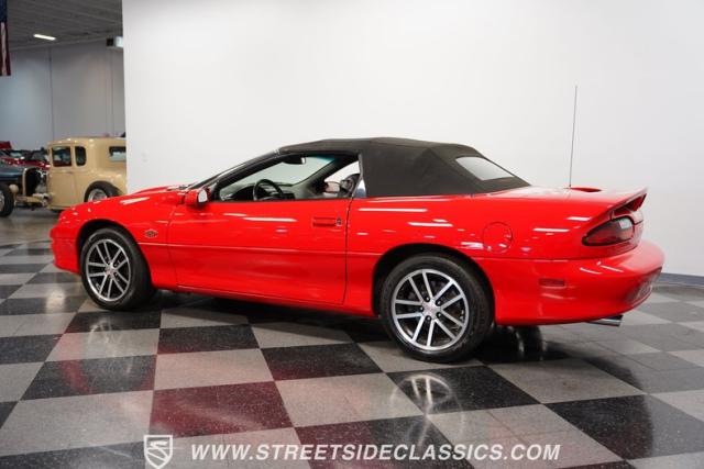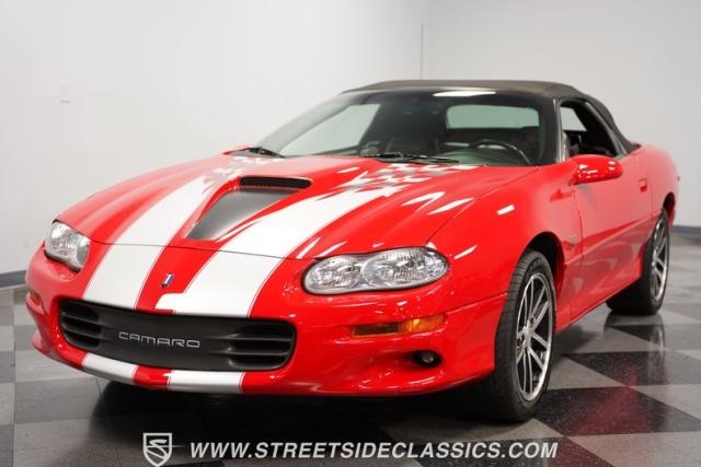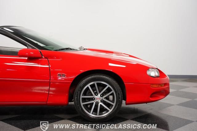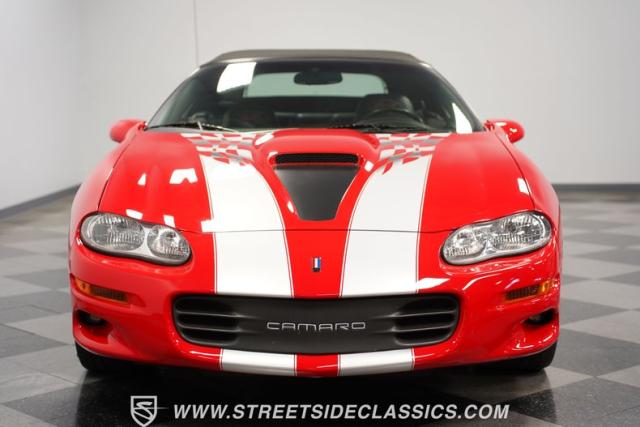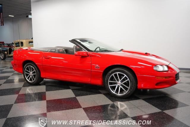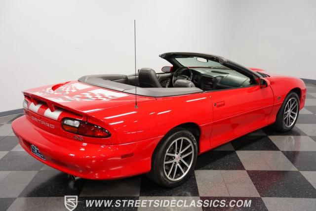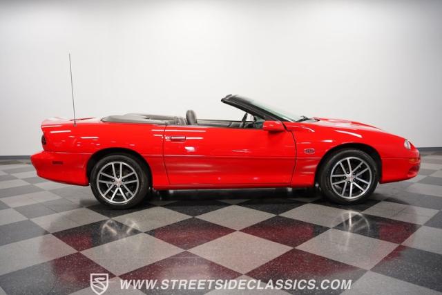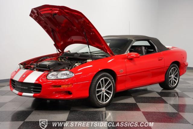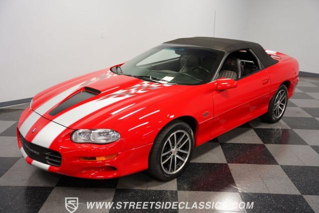 Drenched in a vivid red hue that glistens in the sunlight, this 2002 Chevrolet Camaro SS 35th Anniversary Convertible is rare, with less than 800 automatic transmission models produced. Its white stripes, hood scoop, and commanding presence make it impossible to ignore on the road. The 17\" wheels, wrapped in 275/40ZR17 tires, give this Camaro an assertive yet refined stance. With a simple touch of a button, the black cloth top disappears, revealing an interior that rivals the exterior\'s allure.