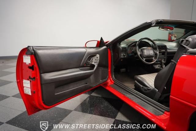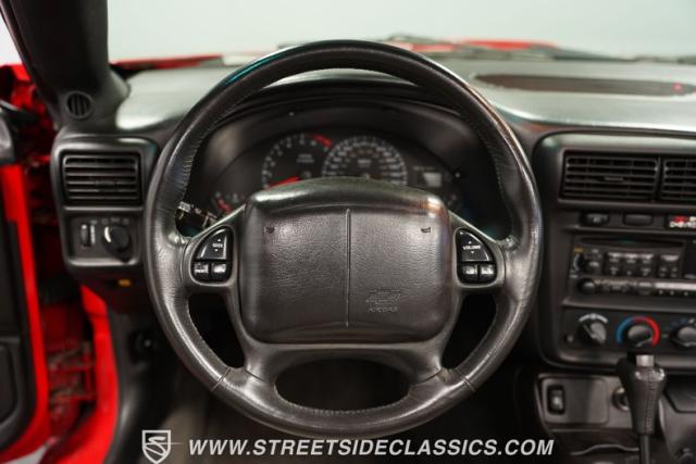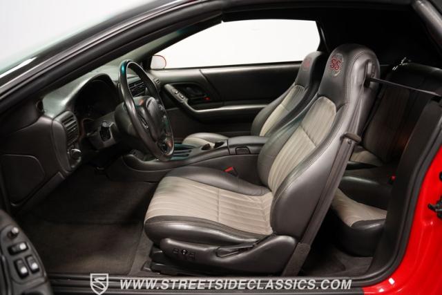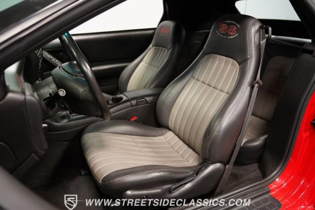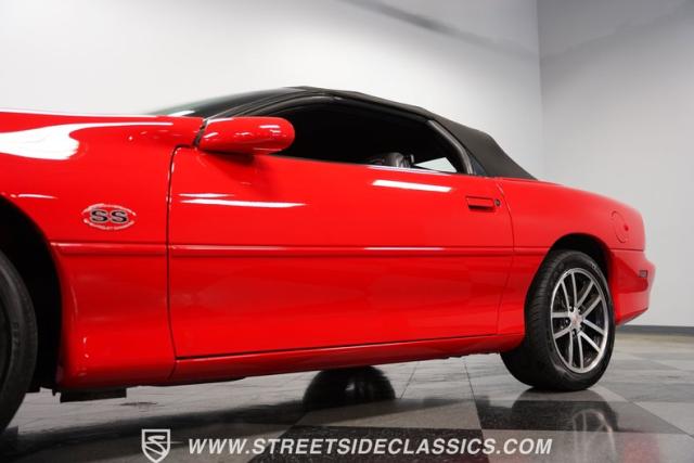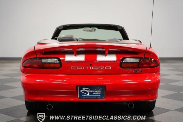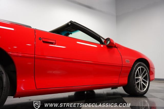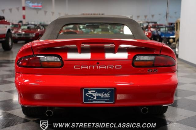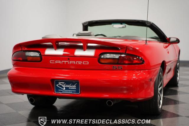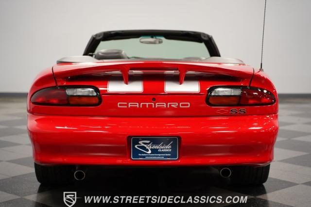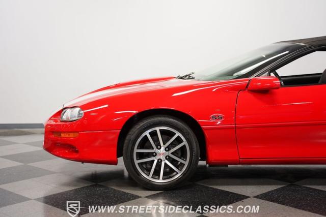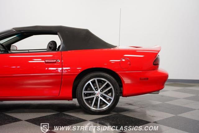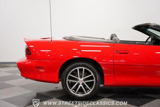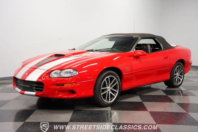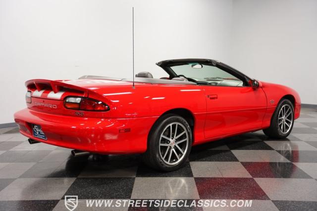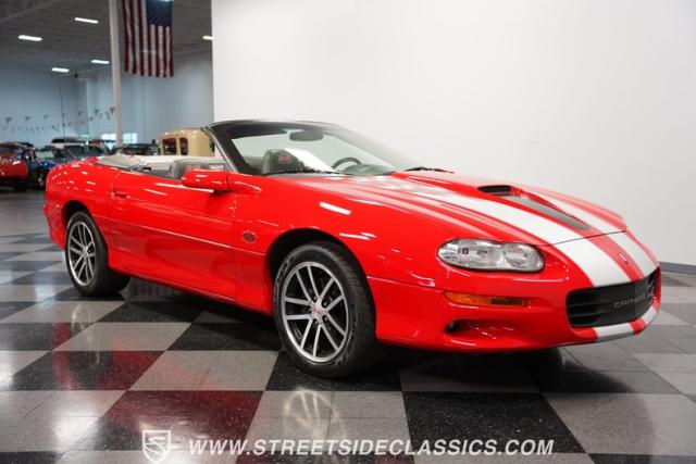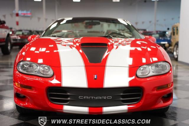 Drenched in a vivid red hue that glistens in the sunlight, this 2002 Chevrolet Camaro SS 35th Anniversary Convertible is rare, with less than 800 automatic transmission models produced. Its white stripes, hood scoop, and commanding presence make it impossible to ignore on the road. The 17\" wheels, wrapped in 275/40ZR17 tires, give this Camaro an assertive yet refined stance. With a simple touch of a button, the black cloth top disappears, revealing an interior that rivals the exterior\'s allure.