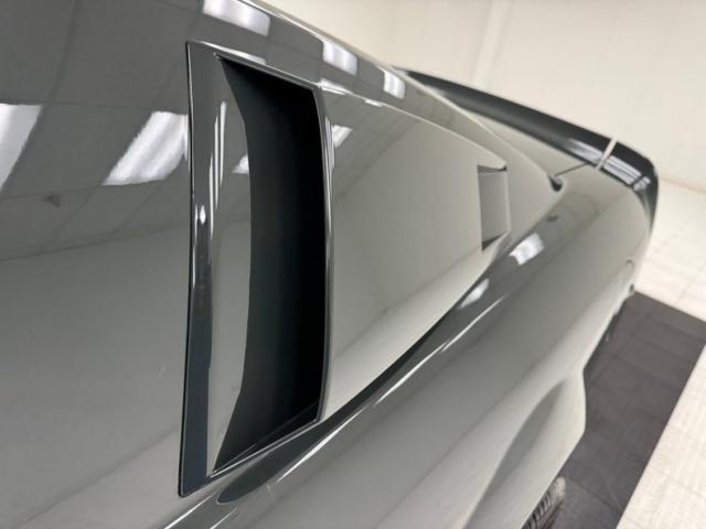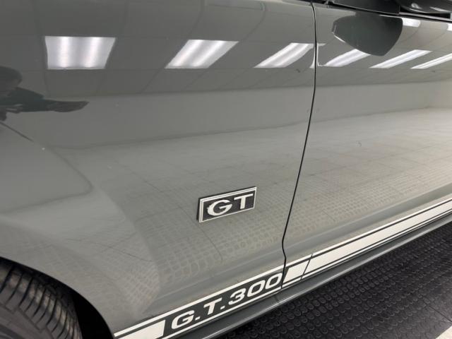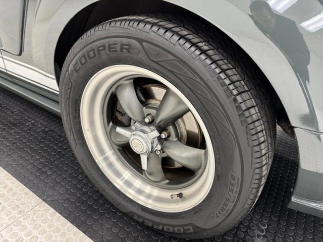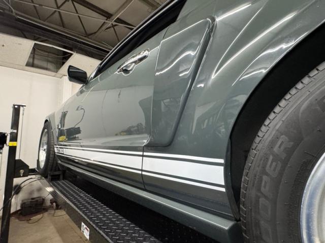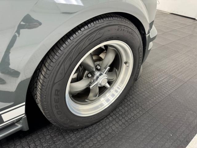 Our consignor had this car painted a unique gray tone and when coupled with some other cosmetic modifications, makes for a Mustang no one else likely has. The enhancements begin with the high performance hood with dual intakes up front and dual vents closer to the cowl, and hood pins holding the fiberglass piece down. Right up front are inboard rally lights close together in the center of the grille, replacing the galloping horse. In profile, the 17-inch Torque Thrust wheels, gray with silver rims, look great and wear spinners, while a white rocker stripe might confuse a few people with its \"GT 300\" display. Intake ducts are in place on the rear quarter panel and over the rear window, Shelby style, while a subtle, integrated rear wing is built into the decklid. Imperfections on the clean exterior includes a spider crack on the front fender, scuff on the hood, delamination on a wheel, and random chips and paint runs.