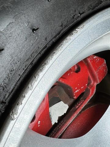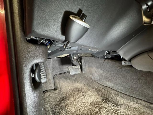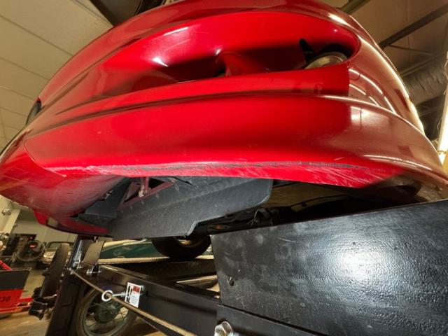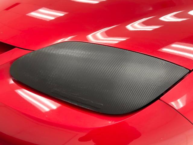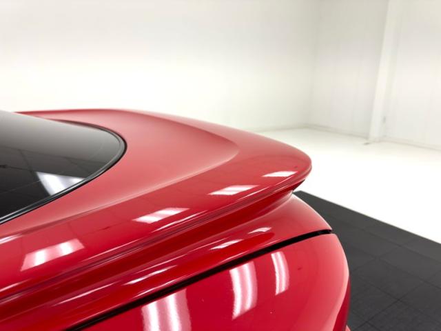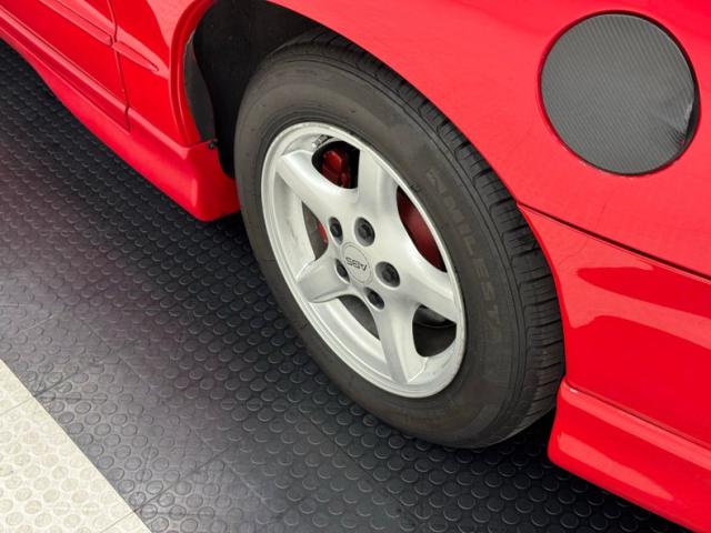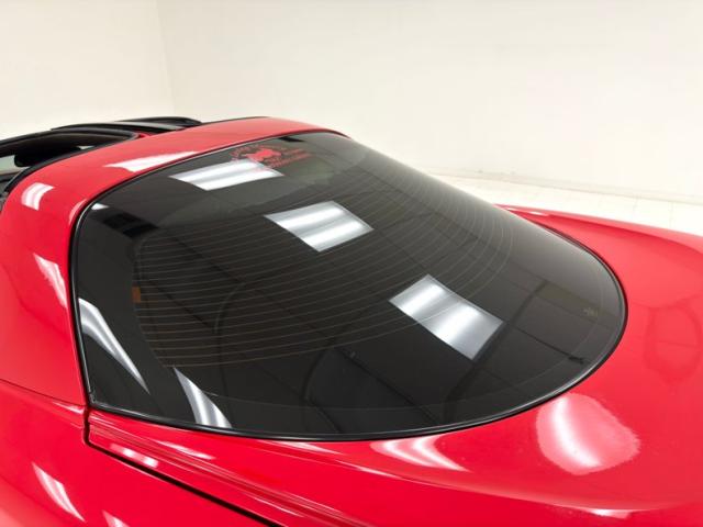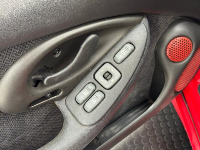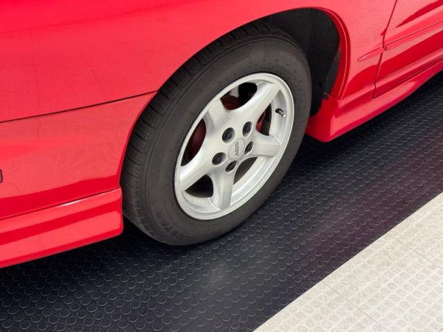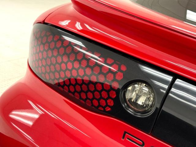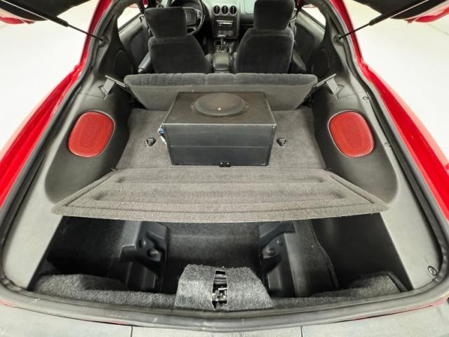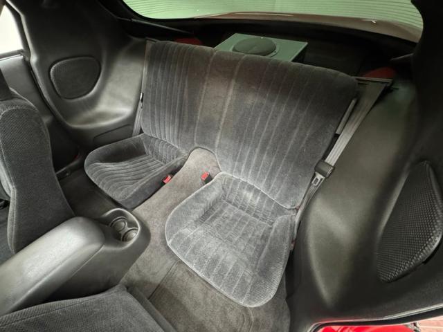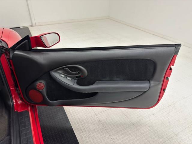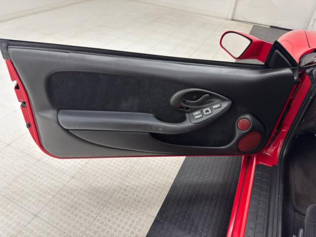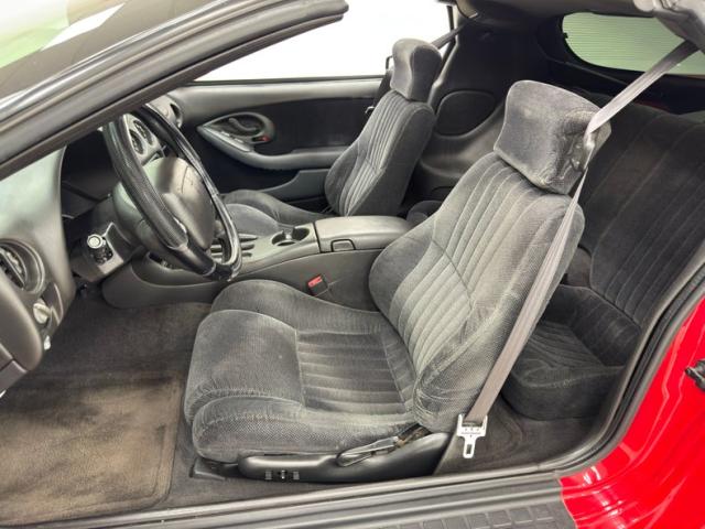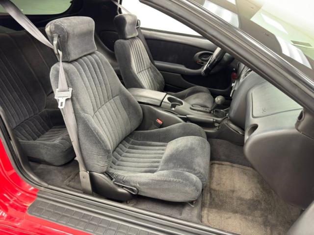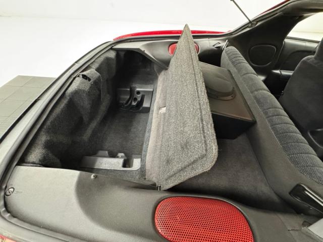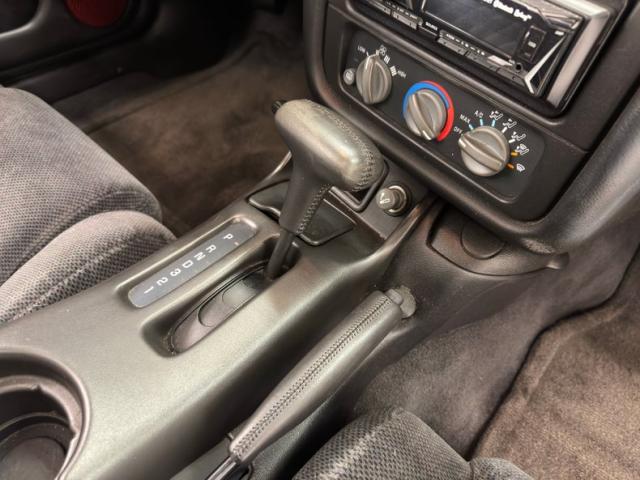 A slightly less aggressive but still sporty fascia fronts the Firebird, here with a mask made up of carbon fiber textured headlight covers and black ornamental plate in front with an embossed Firebird. There\'s a pair of integrated intake ducts and four lensed down below for fog and LED marker lights on this Bright Red car. Meanwhile, a pair of extractor vents, gills if you like, on the fenders wear the Firebird\'s hallmark octagon shaped mesh and from there, the profile is mostly shared with the Trans Am, including the smooth, flat rear wing that hugs the sloping window before spreading surface area to take on the wind. Our octagons return to darken the flush tail lights and dual exhaust fill the sculpted valance. 16-inch wheels carry 215/60R16\'s all around with an early 2023 date code. Imperfections are limited to the typical chin scrapes and some curb rash.