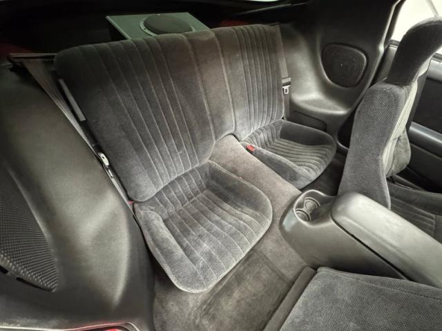 The Ebony interior begins on the door panels made of plastic and cloth inserts, now featuring red grilles for the speakers and the driver\'s side showing some patina in contrast to the passenger\'s door which presents cleanly. Cloth bucket seats up front are in good condition and the 2+2 in back are deep and clean. Basic black covers the steering wheel and simple instrument cluster ahead, offering pertinent information with orange needle indicators. A Jensen AM/FM/CD player has been added over the plastic knobs of the A/C panel, leading to the center console that houses a T-handle shifter, cupholders, and the armrest lid of a storage bin. Charcoal carpet is of the low pile variety, protected by carpeted mats, while the headliner around the T-tops is soft and gray and in good shape. The cargo area now holds a large speaker and has the built in T-top holder for those times when you want to go full Smokey and the Bandit! The speaker grilles here, too, have been accented with red paint.