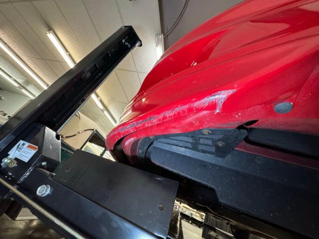 We get her up on the lift and note typical surface rust and patina and also dry conditions other than some residual oil on the rear differential. Power disc brakes are supplied front and rear, and the single exhaust runs to the original muffler which lets out two exhaust pipes that terminate with oval tips. Suspension consists of coil springs up front and coil springs with a torque arm in back.