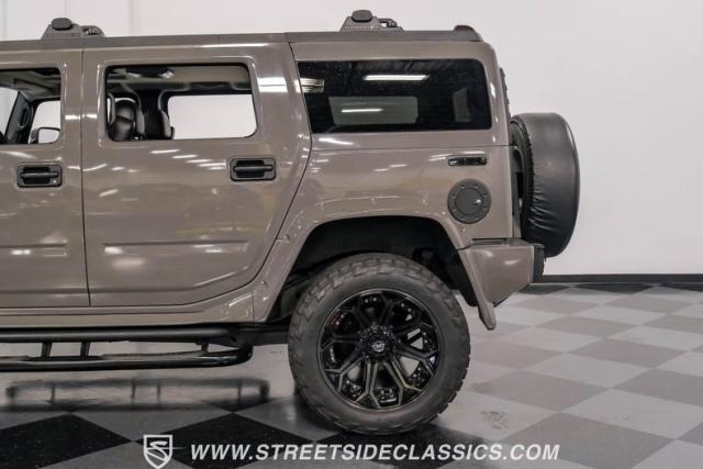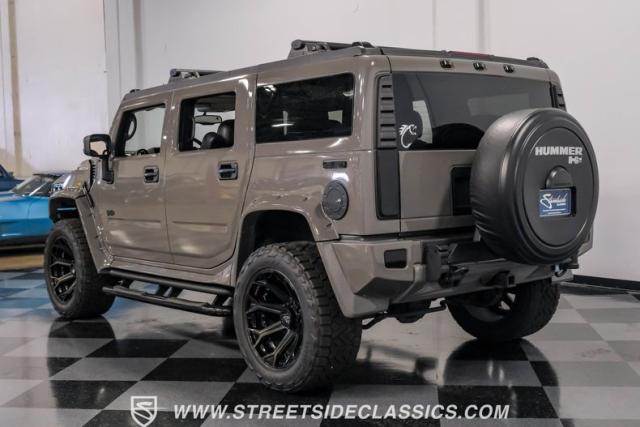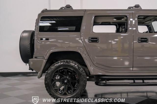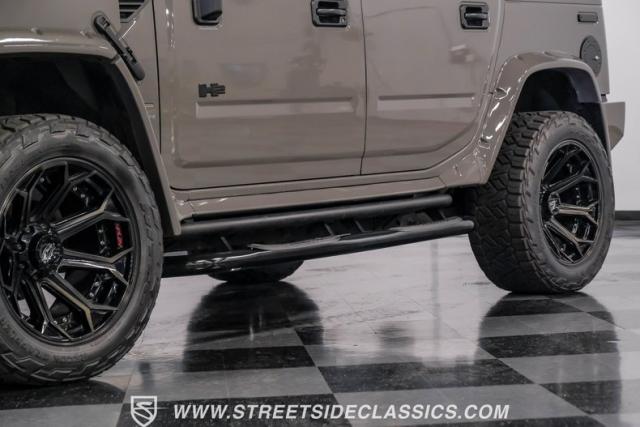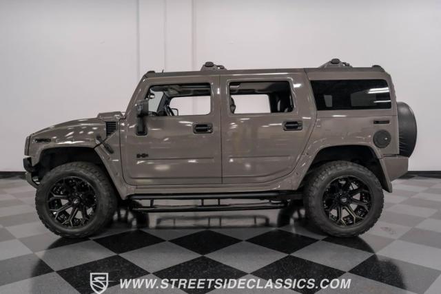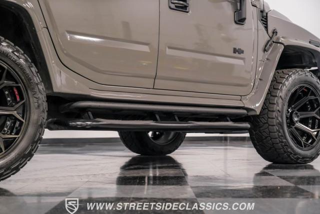 This 2006 Hummer H2 Custom dominates the road with its imposing presence. Defender Gray paint covers every inch of this behemoth, creating a monochromatic masterpiece that sets it apart from the crowd. The absence of chrome amplifies its no-nonsense attitude, while 22\" 4Play wheels wrapped in meaty 325/50R22 Nitto tires from 2023 provide a commanding stance. Running boards flank both sides, offering easy access for front and rear passengers. A bumper-mounted spare tire rounds out the rugged exterior, complemented by tinted windows for added privacy and style.