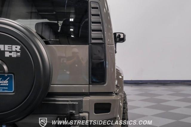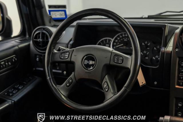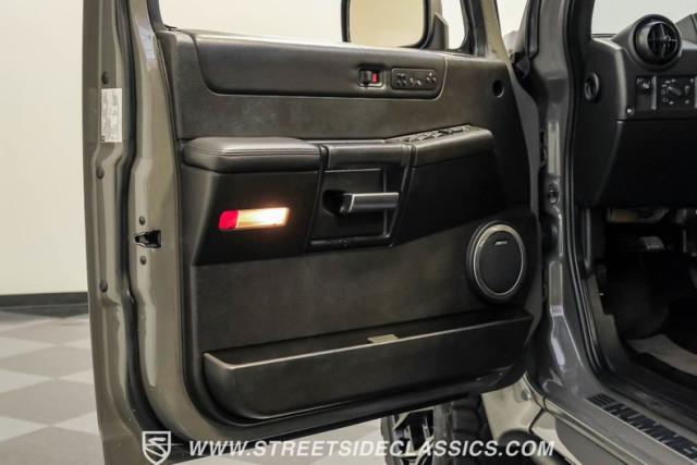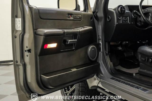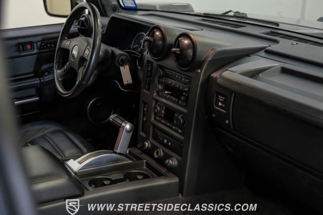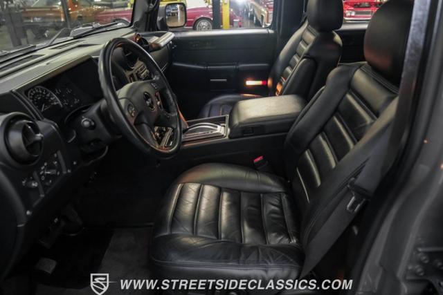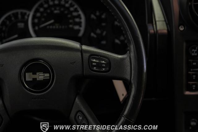 Inside, the H2\'s cabin exudes luxury with an all-black leather interior. The spacious cockpit features three rows of seating, including heated front and rear outboard seats for maximum comfort. A flip-down DVD player with headphone jacks for rear passengers is cleverly integrated into the back of the center console, perfect for long trips. The dash remains crack-free, and the seats maintain a showroom-fresh appearance, showcasing the vehicle\'s excellent care. A Bose stereo system fills the cabin with rich sound, while a convenient button allows all power windows to be lowered simultaneously.